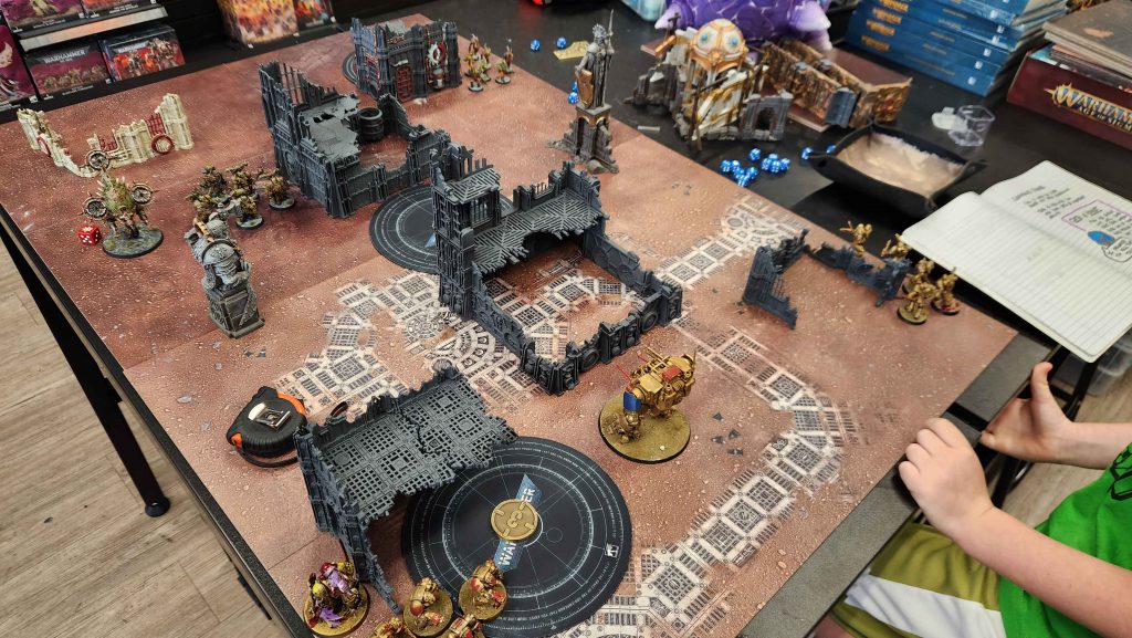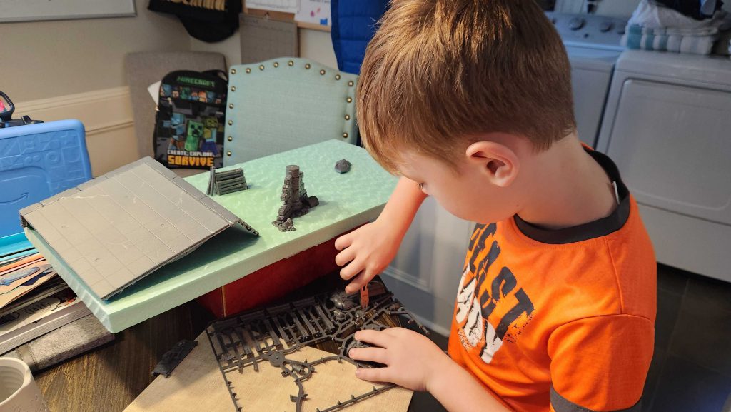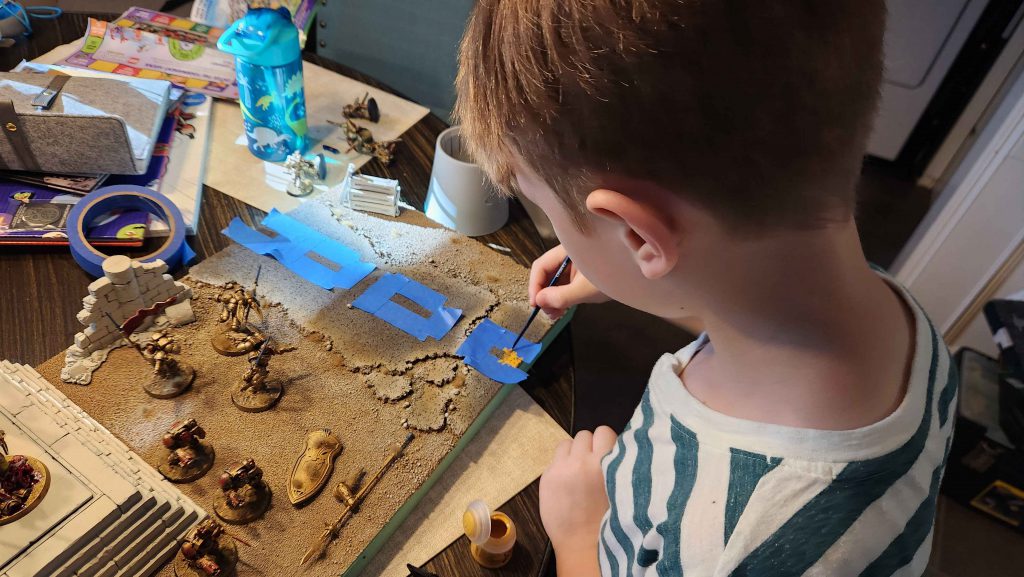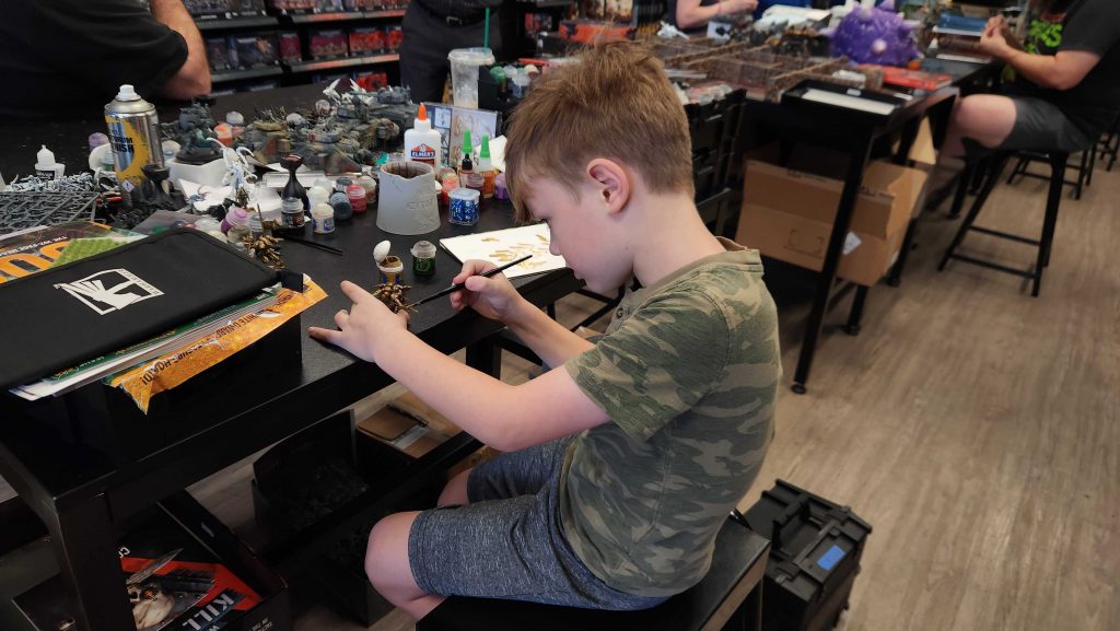 Up to this point, Bryce has painted five Assault Intercessors, five Terminators, a Terminator Captain, an Invictor Warsuit, and he's about to finish his unit of Sanguinary Guard, but they still need some finishing touches. I figure he can run everything but the Guard in a 500ish point game and we can do something simple, with three objective markers on a 44x30 board down at the local GW. I should note that any time we do hobby or game stuff I take him over to the store - it's way easier to focus when we're in a dedicated environment, whereas if we stay home he'll lose interest quickly and gravitate to the nearest screen.