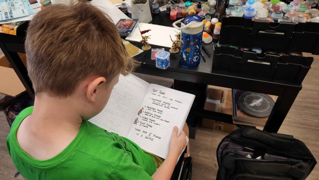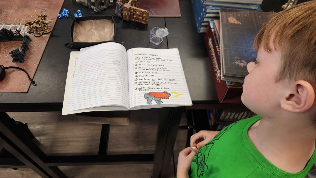 The book serves its purpose well during all of this, and Bryce refers back to it whenever one of his units has to act - I have him look things up as we go. So when the turn starts, I ask him what the first phase is, and he goes back to the phase list and looks it up and tells me. When he shoots, I ask him how many shots and what he needs to roll, and he looks that up too. It's great for the repetition of him learning and also him feeling like he's doing more active things.