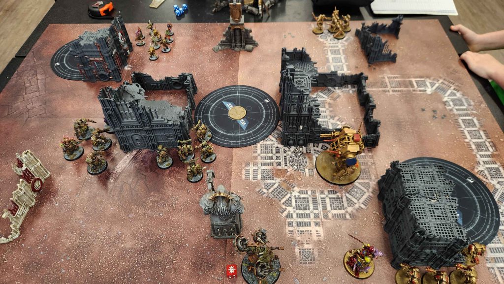 We head over to the local GW on Saturday morning and Bryce puts some finishing touches on his Sanguinary Guard and while we wait for the texture paint on their bases to dry, we play a game. It's simple Hammer and Anvil deployment with three objectives - I'm not really keeping score as I expect him to table me, but I want him to get used to seeing them on the table for now. He doesn't really have the headspace to handle going after objectives, and in his defense, I've known grown men who couldn't wrap their heads around playing objectives and not just killing things.