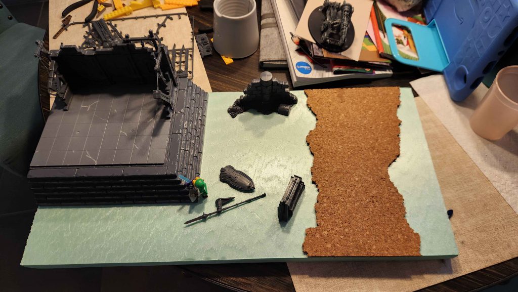 Before that, I help Bryce build a display board. I have an extra sheet of insulation foam sitting around, and it's the right size for Bryce's small army.