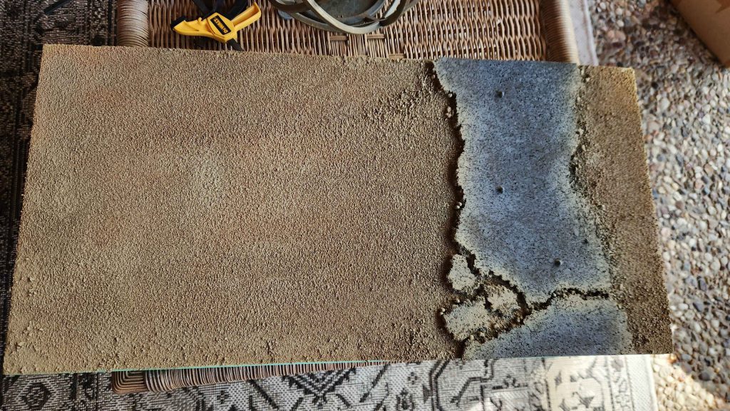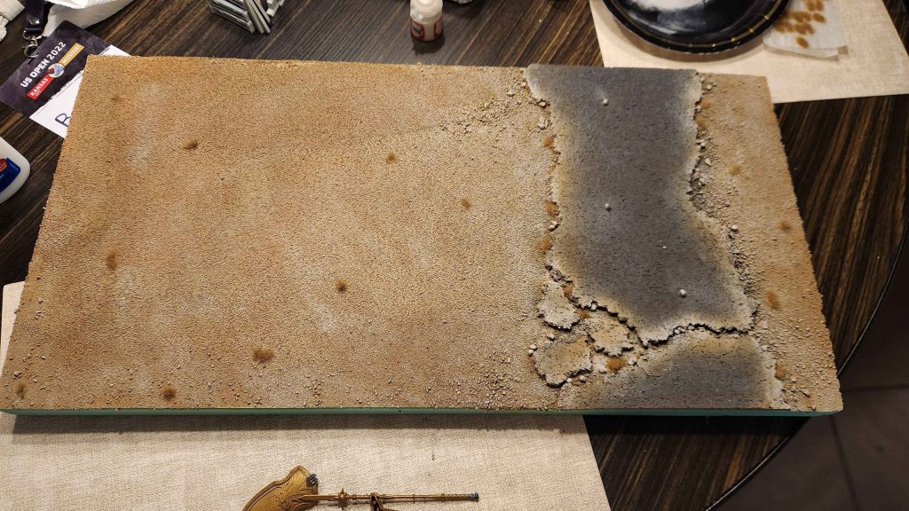 We more or less finish the core board with some brown tufts of grass which will help match the board to his models' bases. I'm pretty happy with it at this point but there's more to be done. Specifically the terrain, plus there are some details Bryce wants to add.