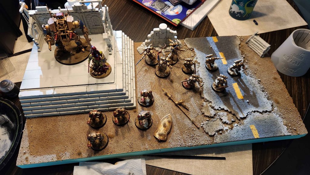 At this point the terrain is still left over. I'm not actually sure if we're going to paint it in time for this weekend, but if we don't, the board is plenty good as-is. I may even end up using it for my Thousand Sons in a week. At the very least I think I can prod him to paint one or two of the pieces of scatter terrain.