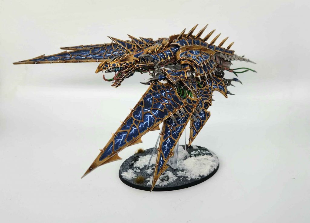 One other thing I wanted to do was bring a Heldrake to the Narrative. I've got two painted Night Lords Heldrakes, but they were both painted years ago and still need quite a bit of work to get them up to the level of quality I want. That said, touching one up is also faster than painting a whole new unit for Saturday's Armies on Parade, so I opt to touch him up this week. This is mostly a process of doing the interior panel lining on the Heldrake's trim, then improving the shading on the gold trim.