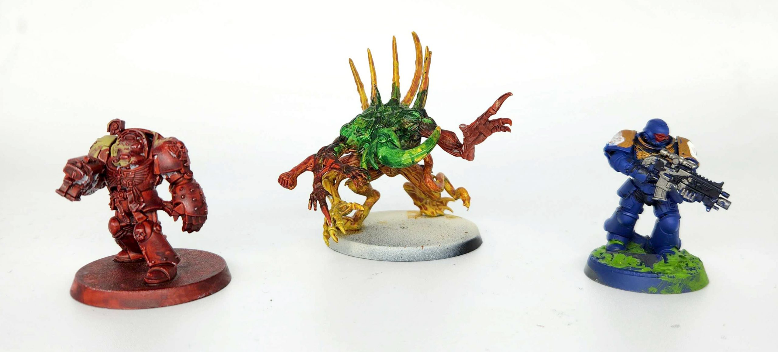 Bryce's first models were mostly just contrast jobs - you can see them up top, with the Terminator and the Chaos Spawn. His third model was that Ultramarine, who we spraypainted blue and he added some gold paint to. Those were painted when he was 5 and 6, and we were overdue to paint some new models.