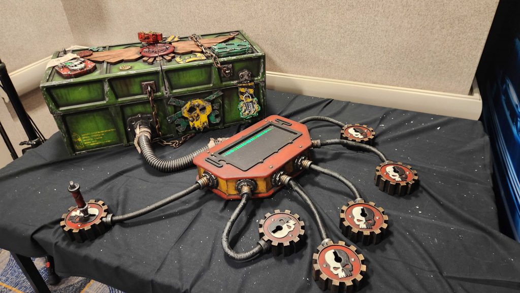 I didn't sleep a ton on Friday night, but mostly that was because of staying up late drinking. I wasn't in bad shape or anything but I was pretty tired Saturday morning. I grabbed some breakfast with Gunum and then hit the briefing. There were a number of new doodads introduced yesterday - a series of large, expensive props with light-up elements to represent the three artefacts being sought out by each faction. For Chaos, it was the Blade of Night, unlocked by completing the altar of Chaos. For the Orks, it was the Wurrzog machine, some kind of force field generator. And for the Imperium, it was whatever mysterious xenotech was in this Ork box.