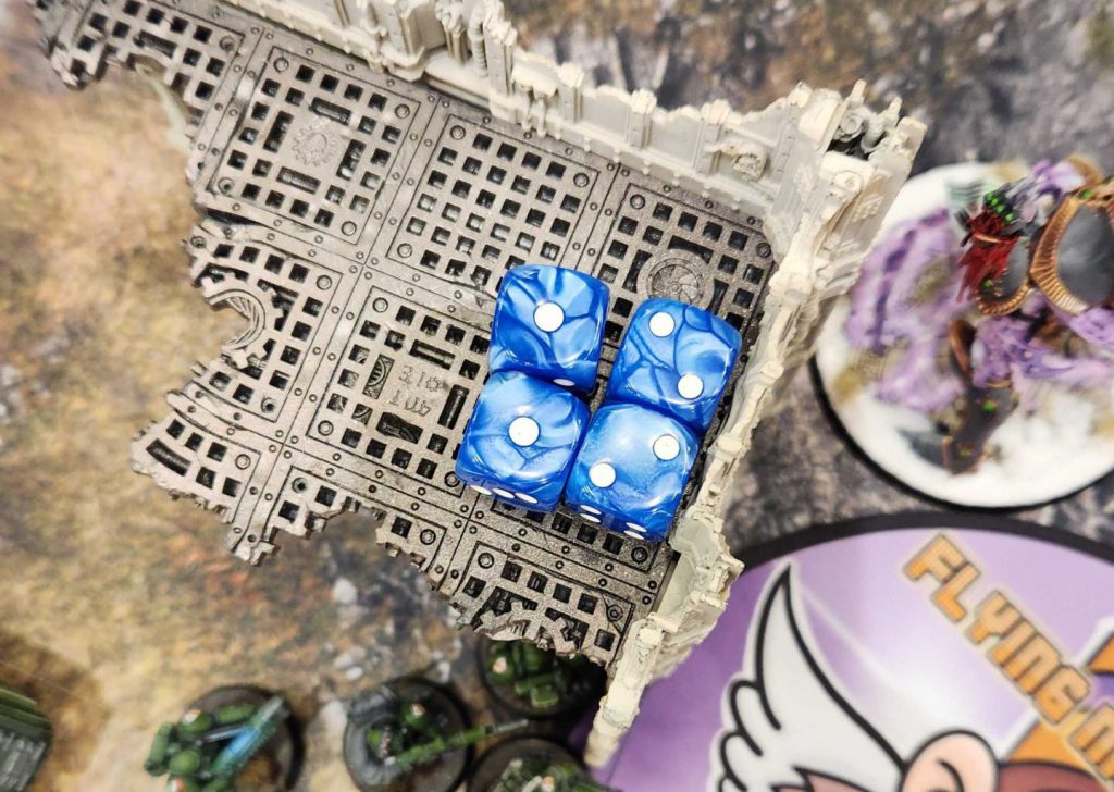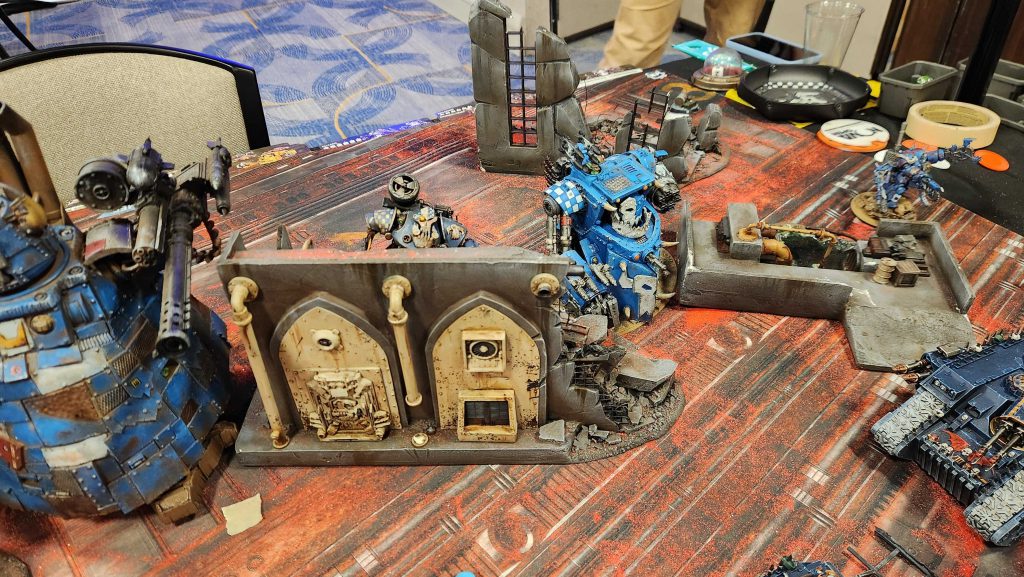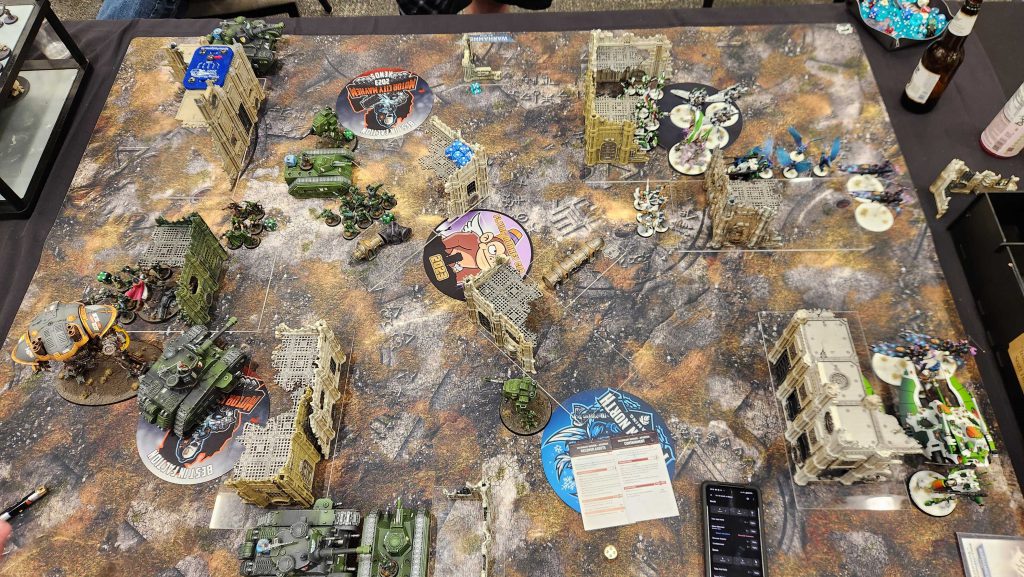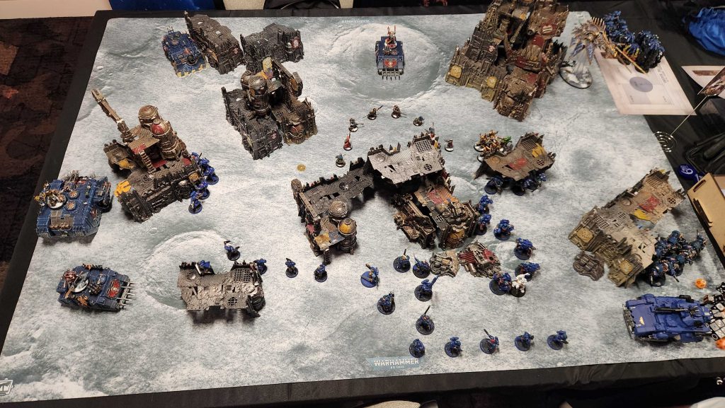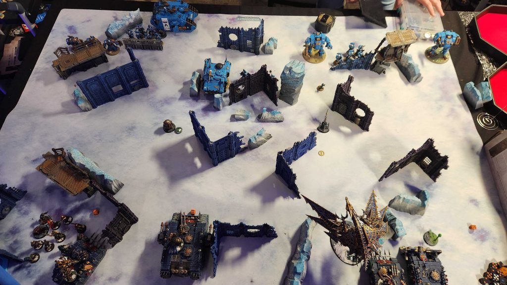 For round 4 we were in Futility. This mission was absolutely wild - there were no deployment zones or objectives (once again putting me on Veterans of the Long War), and instead we deployed by basically alternating deep striking units, with it being possible to place a unit within 9" (and outside 3"), but with the penalty of taking D6 mortal wounds.