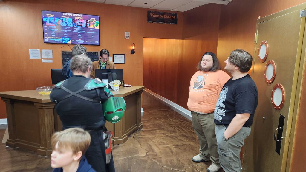 After some poking and prodding we get there and he cheers up a bit. Which is good, because we've already booked an escape room for that evening. While some of our crew are heading out Sunday night, we and more than a few others are flying out Monday, and so there's lots of time to do other fun stuff. So we hit up the Escape Room place next door to the hotel, over in that food court area.