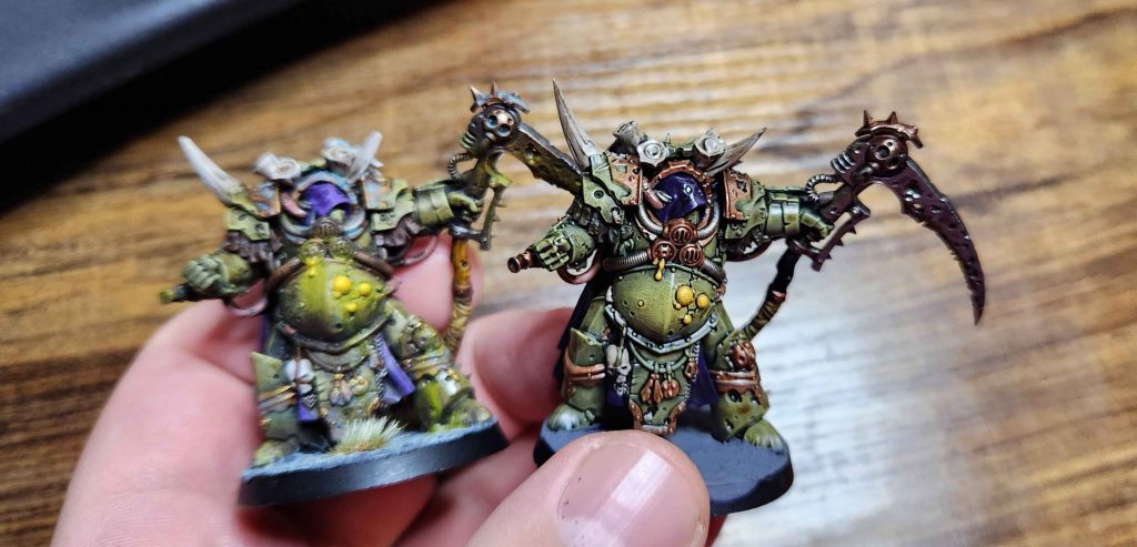 That's a hell of a lot to get painted in a single week, even with my Death Guard scheme. The good news is that the Defilers were all assembled, though I spent longer than I'd have liked searching for the last two missing legs on one of them. For the Deathshroud I enlisted a friend to help apply the base coats before I'd finish them off with the final details. As I mash this out Wednesday night, here's where things stand.