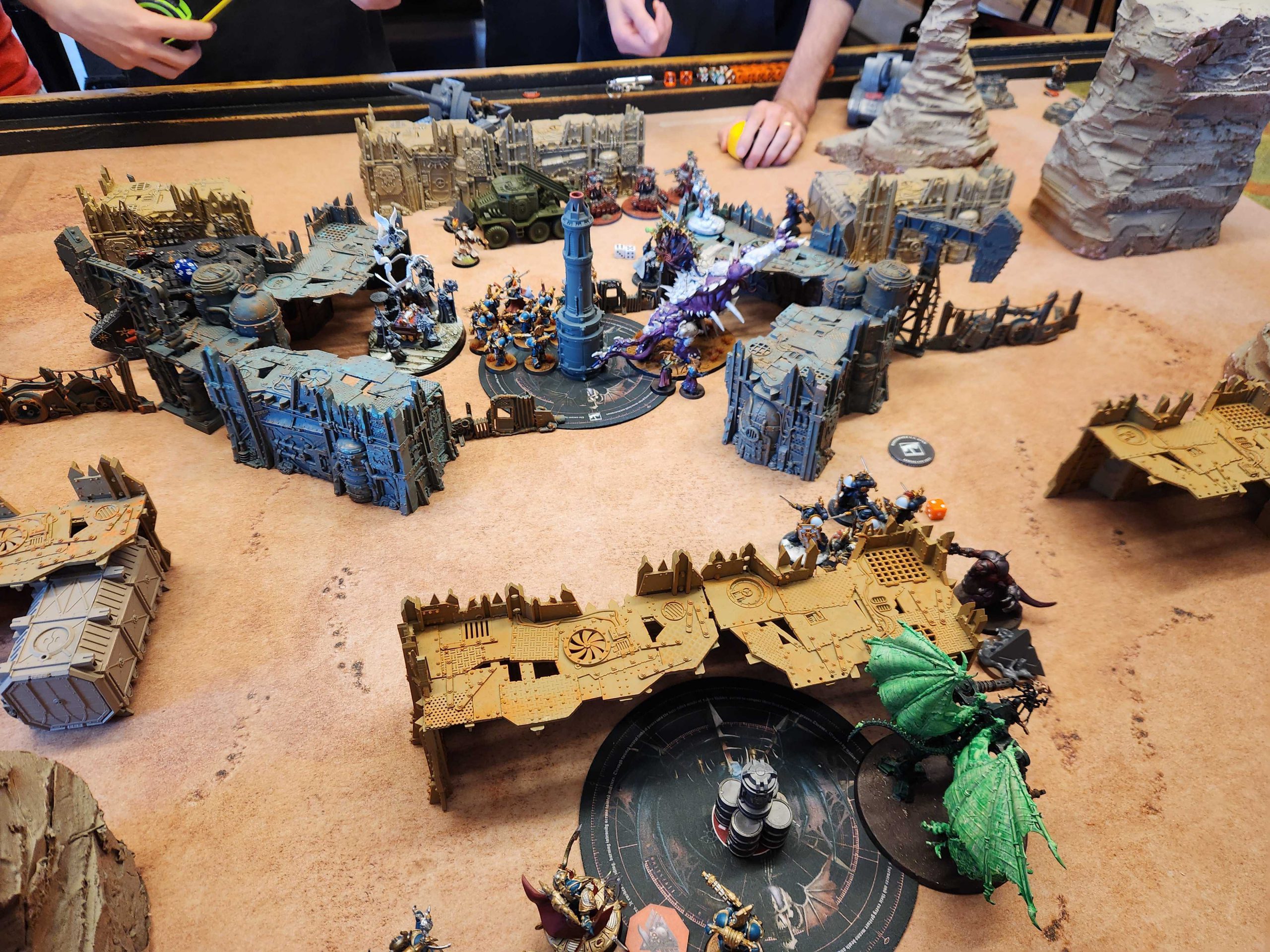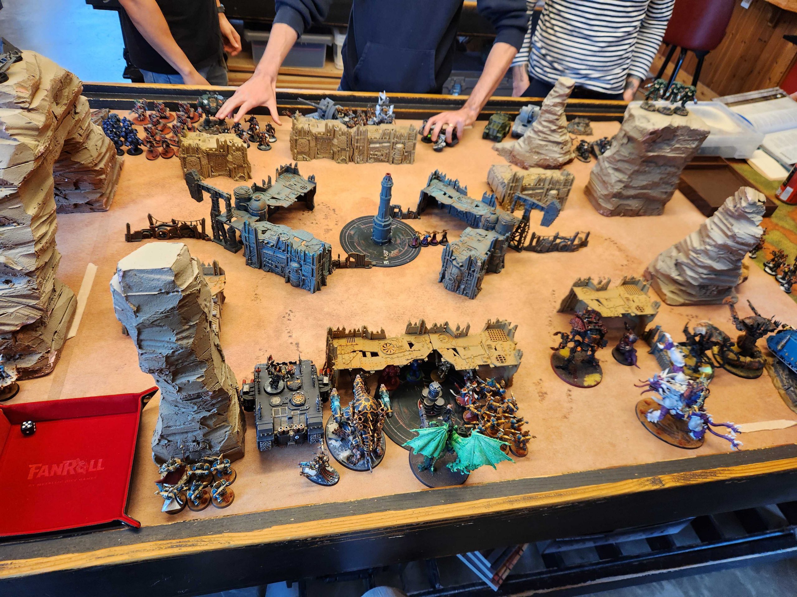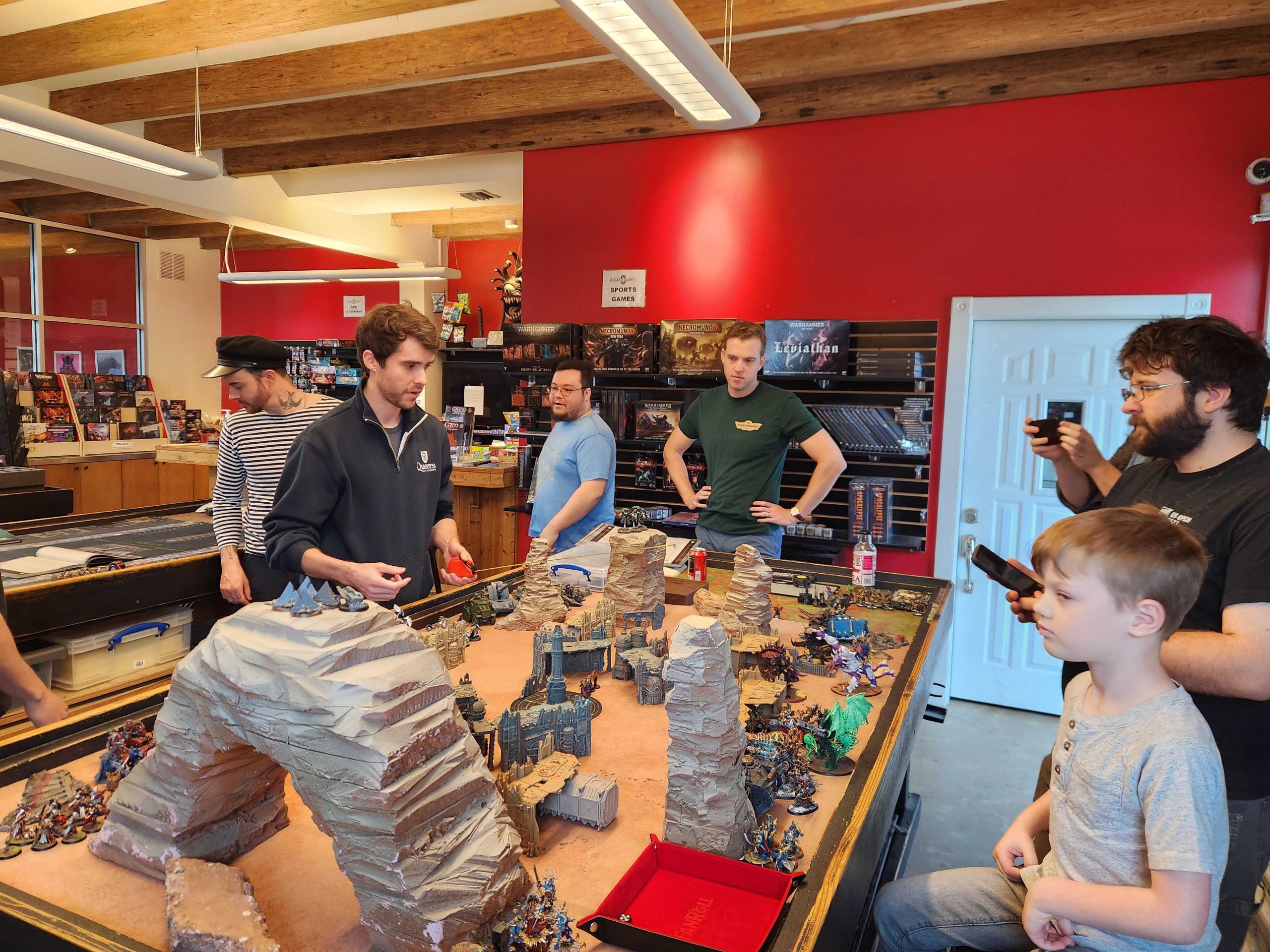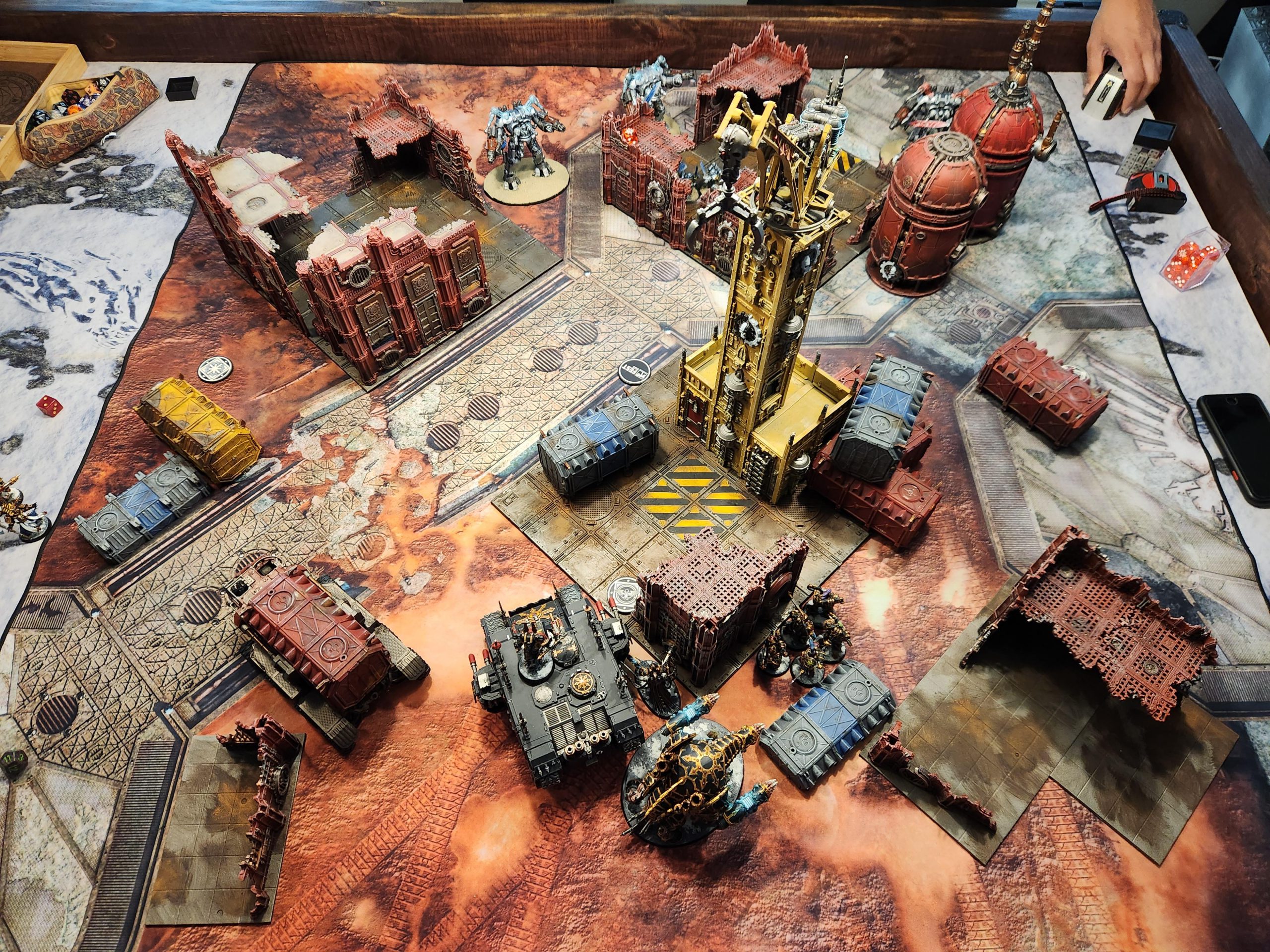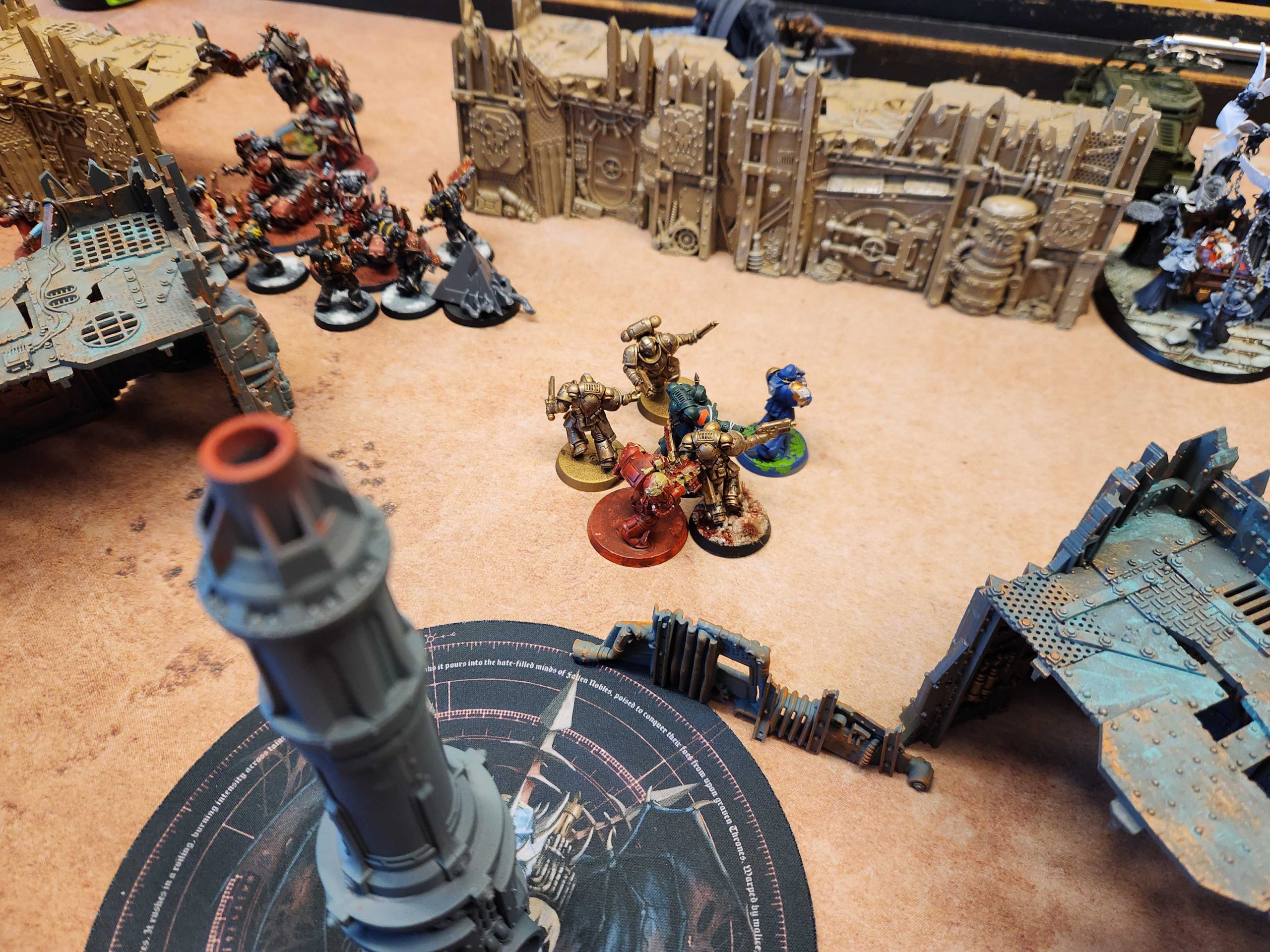 T E A M G A M E. My team has been setting up a big showdown for a while now, and I may have agreed to it without thinking. Anyways I show up at Asgard on Saturday for a team game. That said, a lot more Imperial players showed up, so what I thought would be a 3v3 or a collection of 1v1 or 2v2 games ends up being a 6v3 with 3,000 points per side. I keep the same number of points with my standard list, but to fill some gaps I bring along an ally. Specifically, Bryce with his single unit of Assault Intercessors. He's here for hits first game since the intro game, and while he doesn't have a ton to work with, keeping track of one unit is about his capacity at this point.