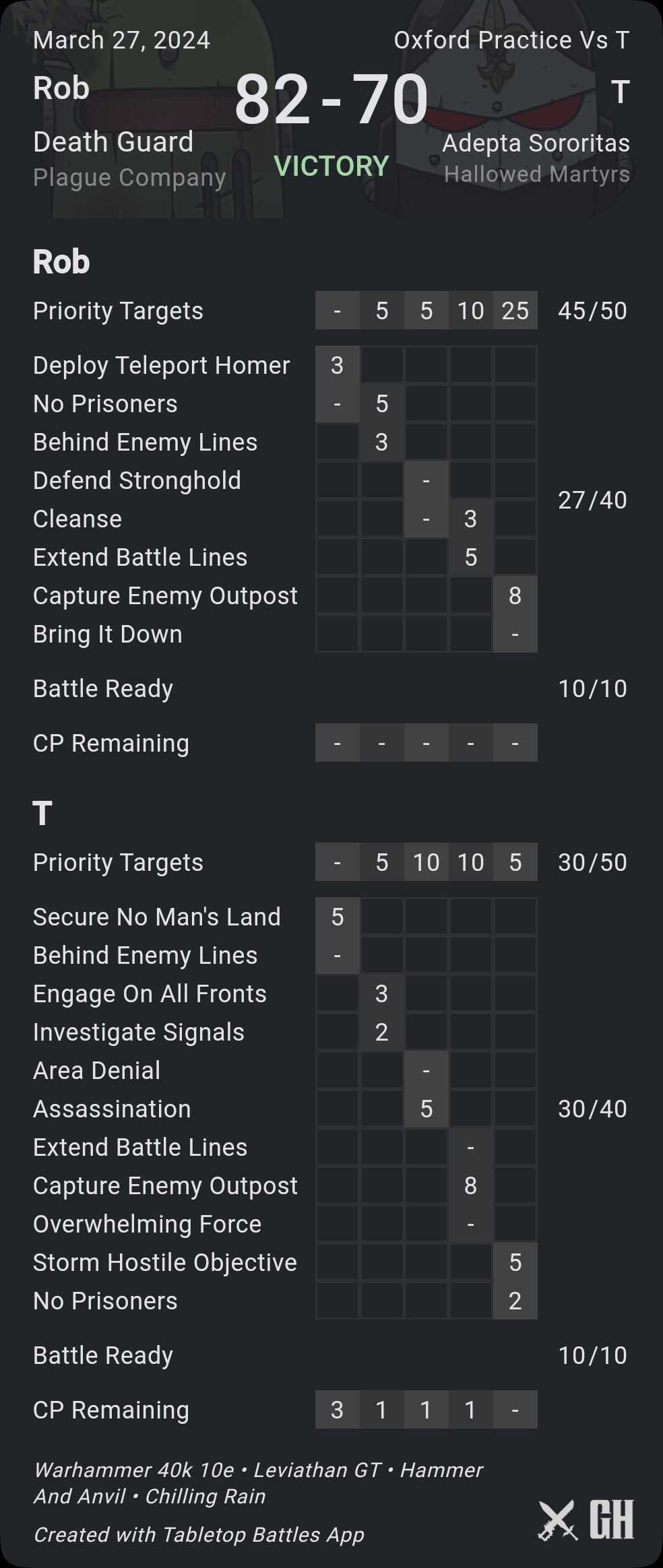 I'm able to eventually reclaim my home objective using PBCs and their OC 4 bodies while Typhus and his Deathshroud are able to take care of Celestine and her retinue. I max Cleanse and Extend Battle Lines on round 4, then Capture Enemy Outpost on the final round (I can't score anything for Bring it Down at that point as all of T's vehicles are dead). It's not a full tabling, and T snags a kill on the final turn and recaptures an objective to pull 5 for Storm Hostile Objective and 2 for No Prisoners. He's only holding one objective at the end of the game though so while it's been pretty close up to this point, I pull 15 on Endgame to outscore him 82-70.