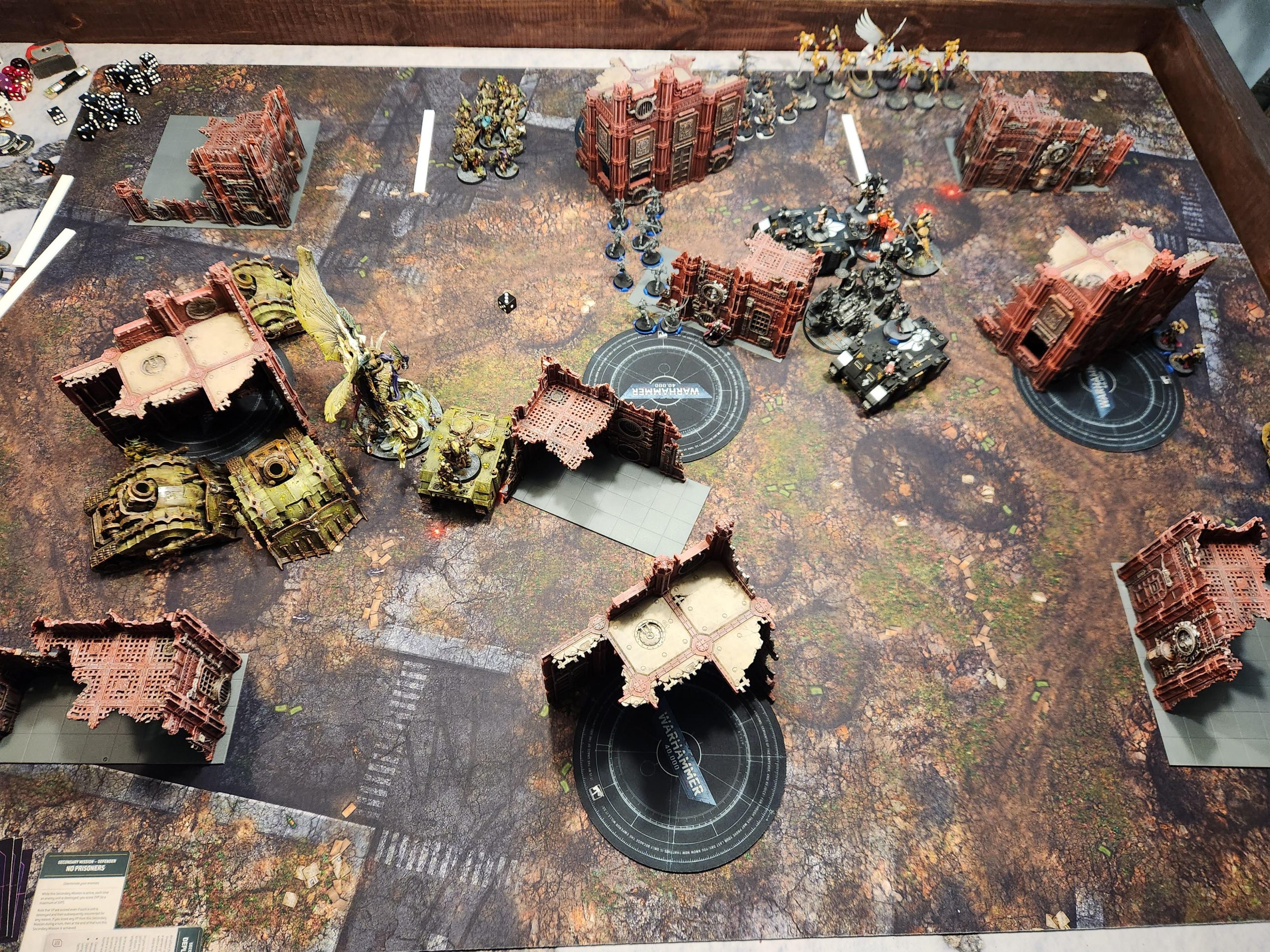 This game took a long time. Having six players on the other side was always going to make things slower, and we run close to five hours of total play time. There are some good moments in there - fighting over the middle, deep striking into each others' backfields, and trying to steal objectives and double move them back to our home objective with Rubrics.
