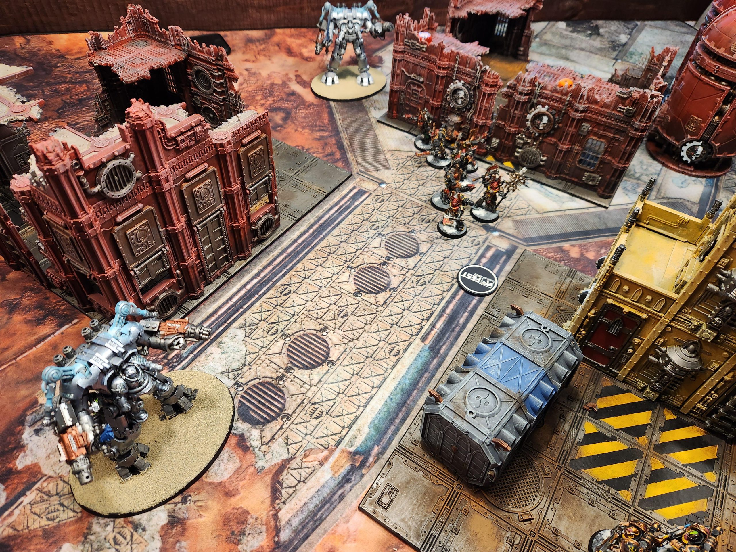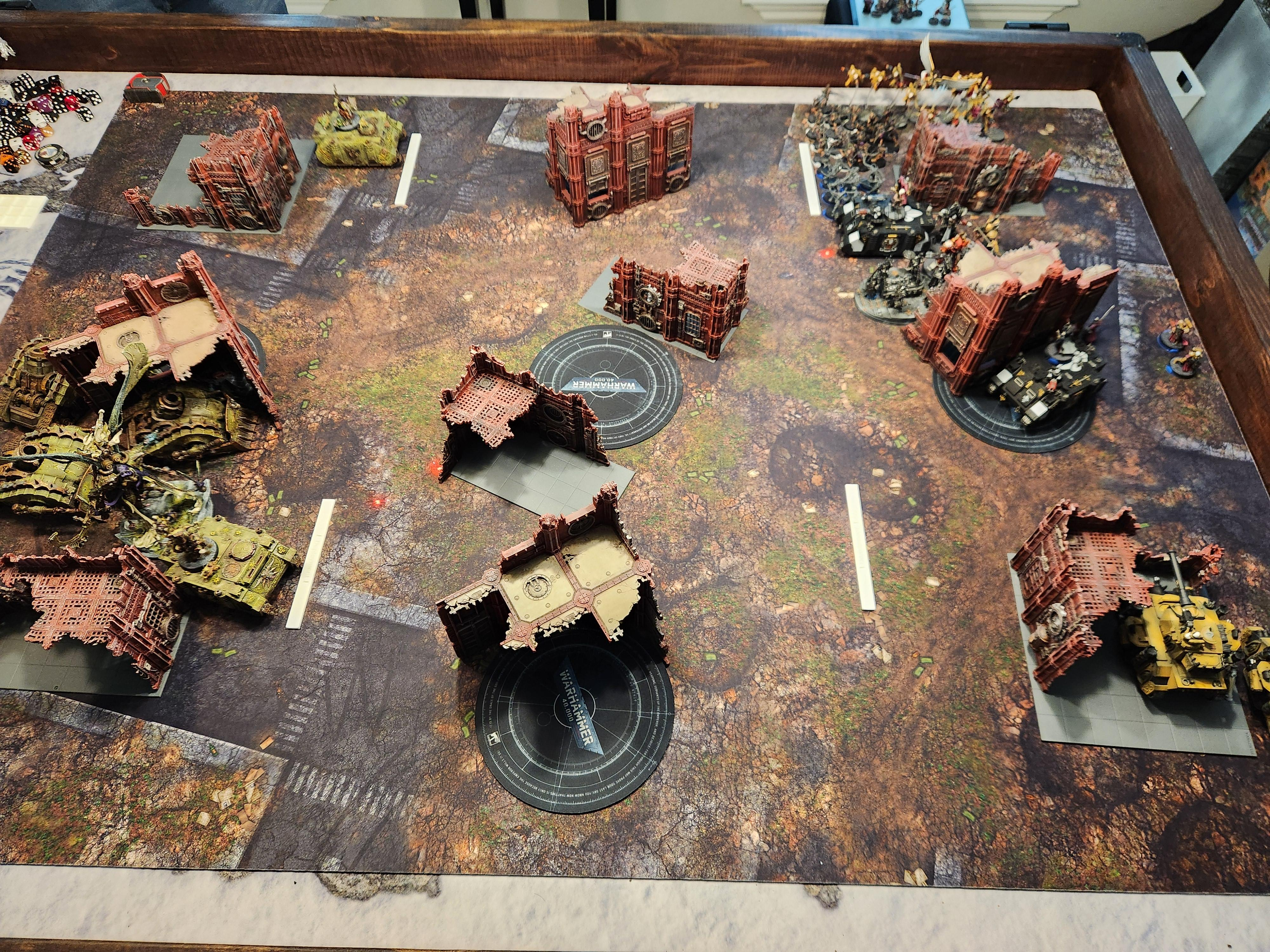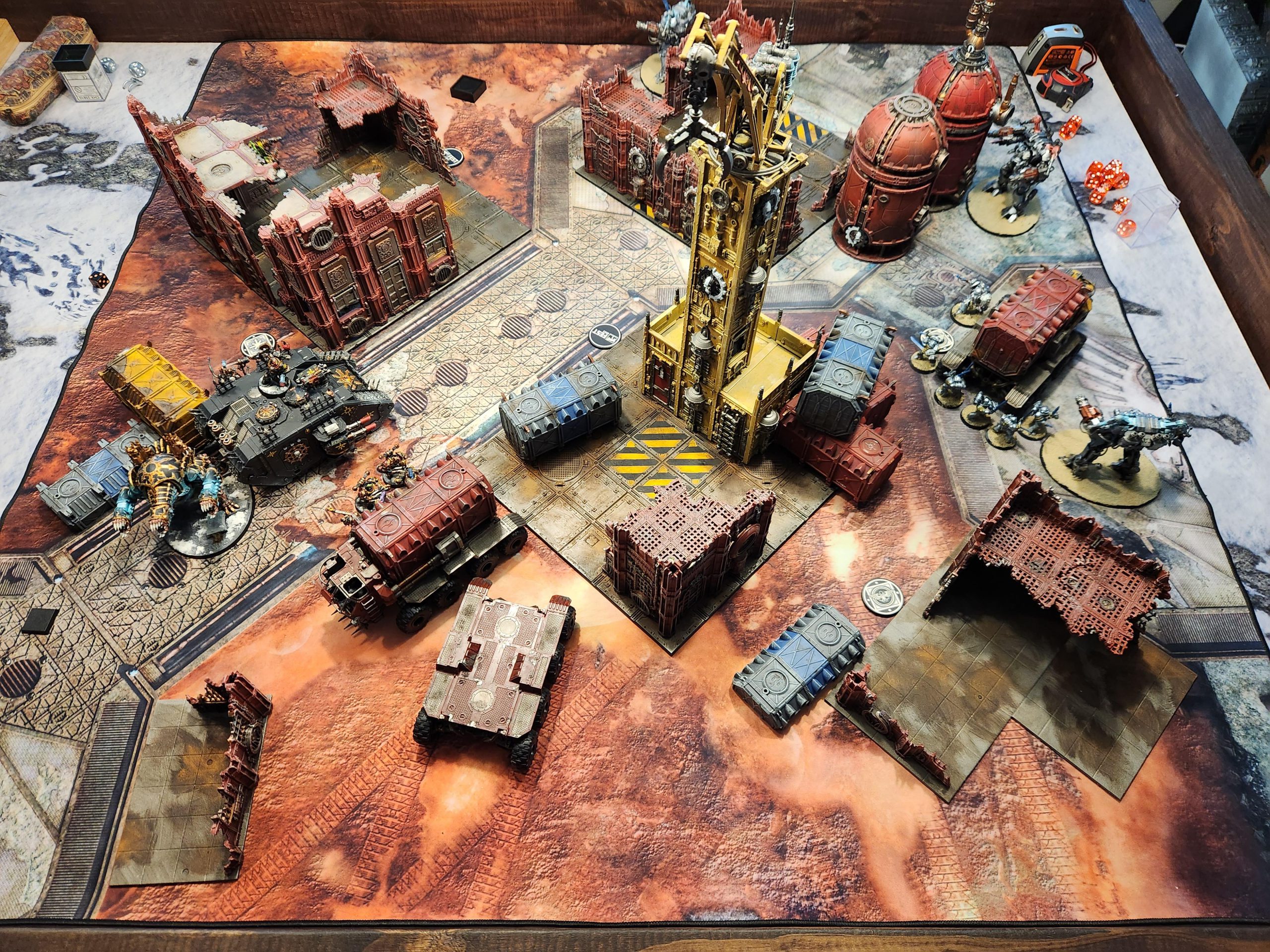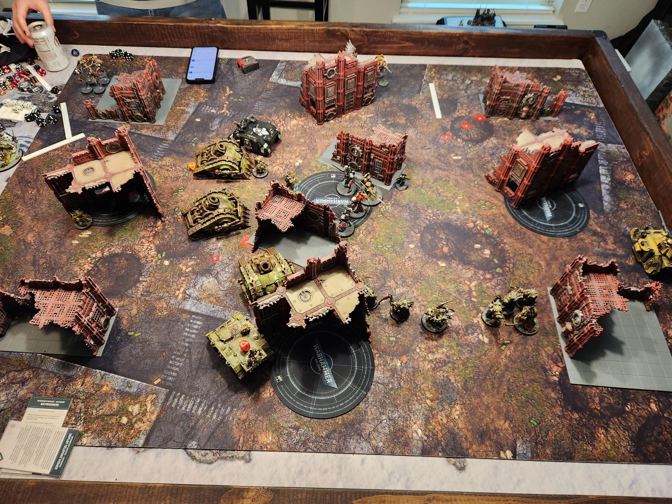 - This terrain is hard to hide on. I'll test other layouts in the future, but this game one layout is really open and shooting-heavy. I've got a few more games to play on it to get used to it but I need to figure out a good balance between "conservative deployment" and "being so far back I spend a whole round digging out of my deployment zone," especially since that just puts me in the open a turn later and that's no good either.