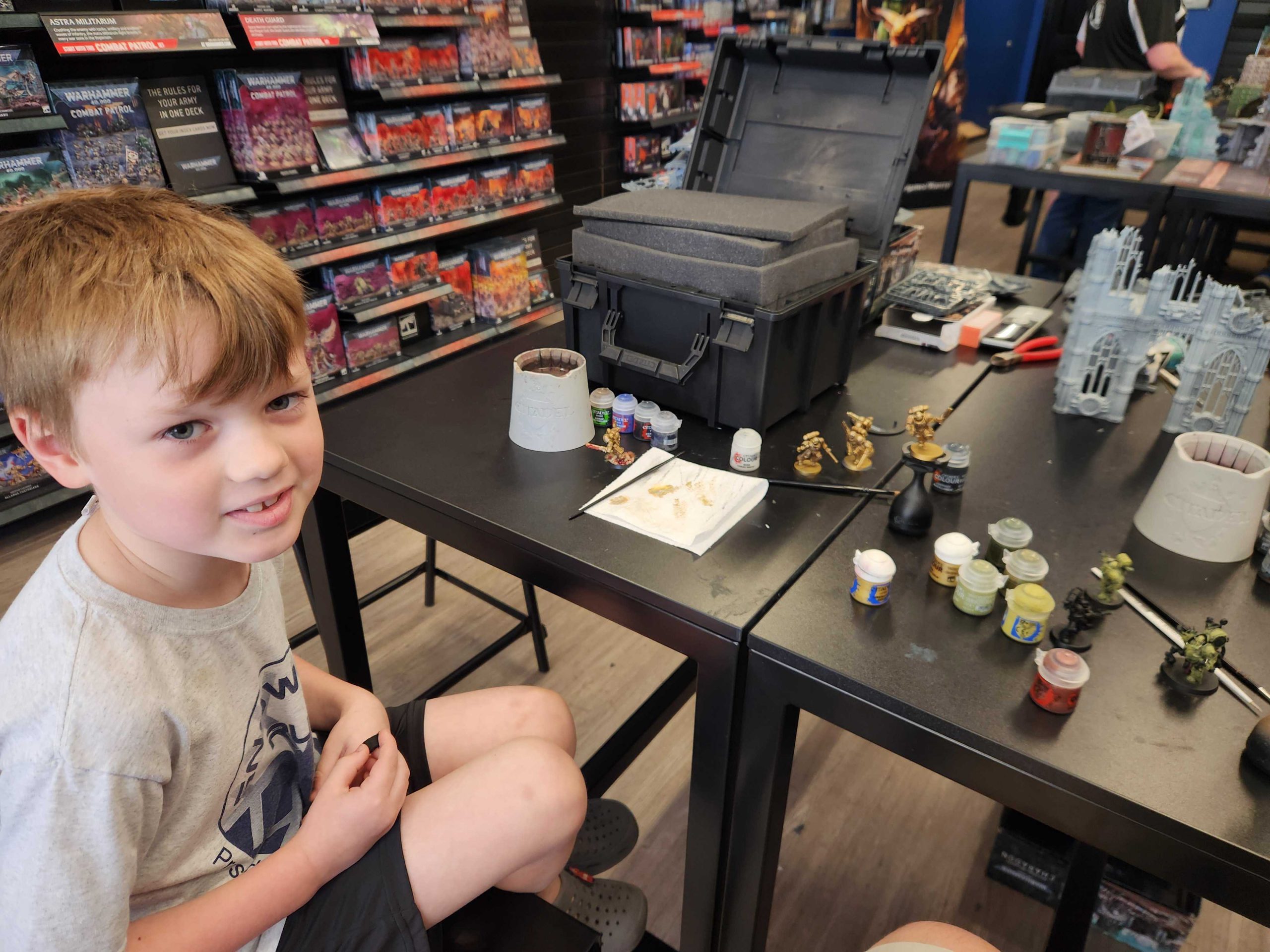 That just leaves some hobby work to do. I'm not painting the second Blightspawn, but I do need one more Plague Sprayer for my Plague Marines, so I need to get him painted up. I've also got two more Assualt Intercessors for my son Bryce, so we pack up the rest of his squad and head over to the local Kingwood Warhammer to do some more painting.