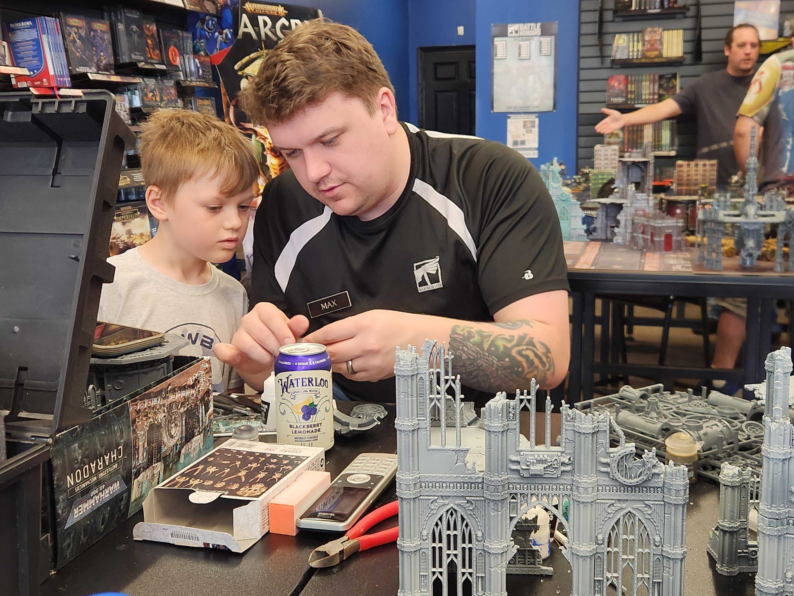 Max - the Kingwood Warhammer store operator and all-around great guy - also pitches in, helping Bryce build his first character: A Terminator Captain converted using some extra parts. Bryce helps pick and clip the bits, and Max helps assemble them.
