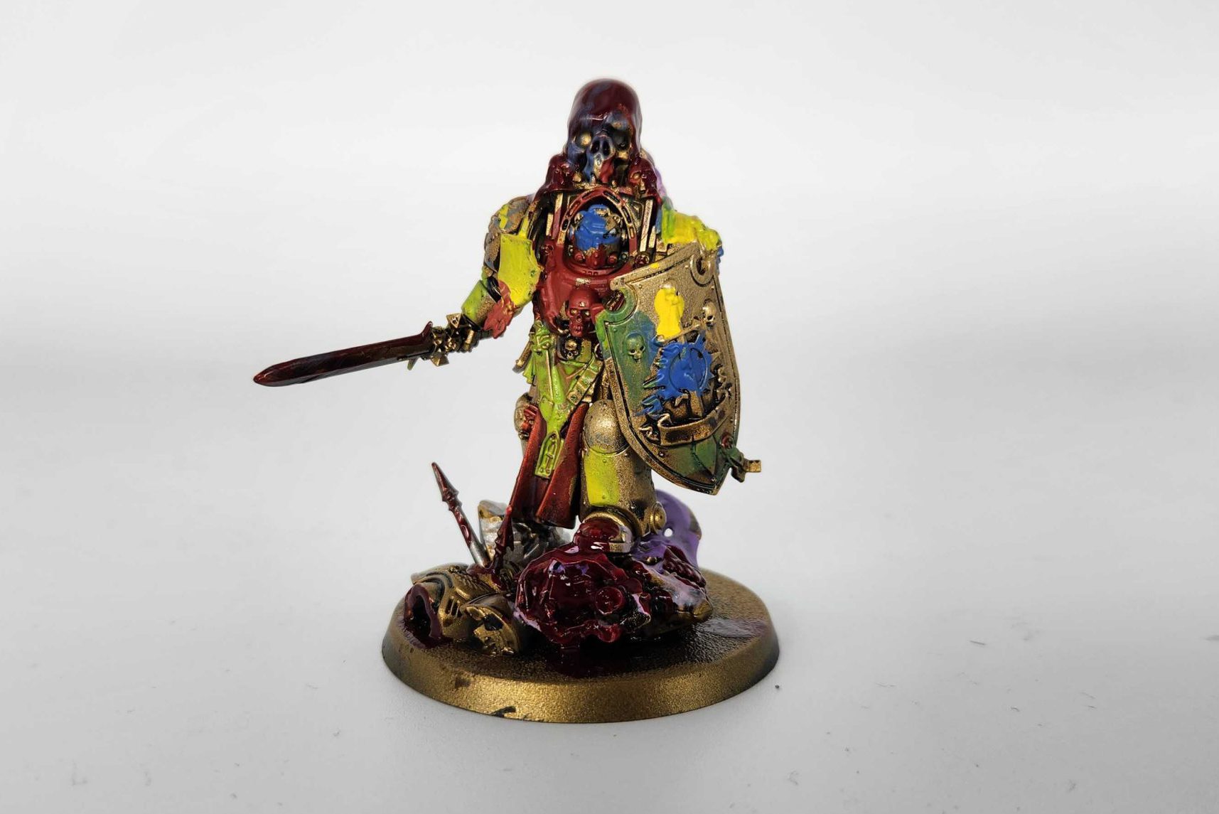 They'll end up making a little base of bodies for Bryce's terminator captain to stand on, and add some skulls on top. Bryce is eager to paint the guy immediately, but we have to wait for the glue to dry and it's been a few hours so we head home. Once the glue dries I prime the captain with Retributor Armour and bryce begs me to let him paint him. I finally relent, and to my pleasant surprise, Bryce has gotten pretty good at using paint stands and painting without making a mess. He washes and drybrushes his captain, paints the robe, and adds some blood effects. It's all looking pretty good until he sneaks off without telling me and adds a bunch more paint to the model. He's made some interesting choices painting the guy, I'll say that.