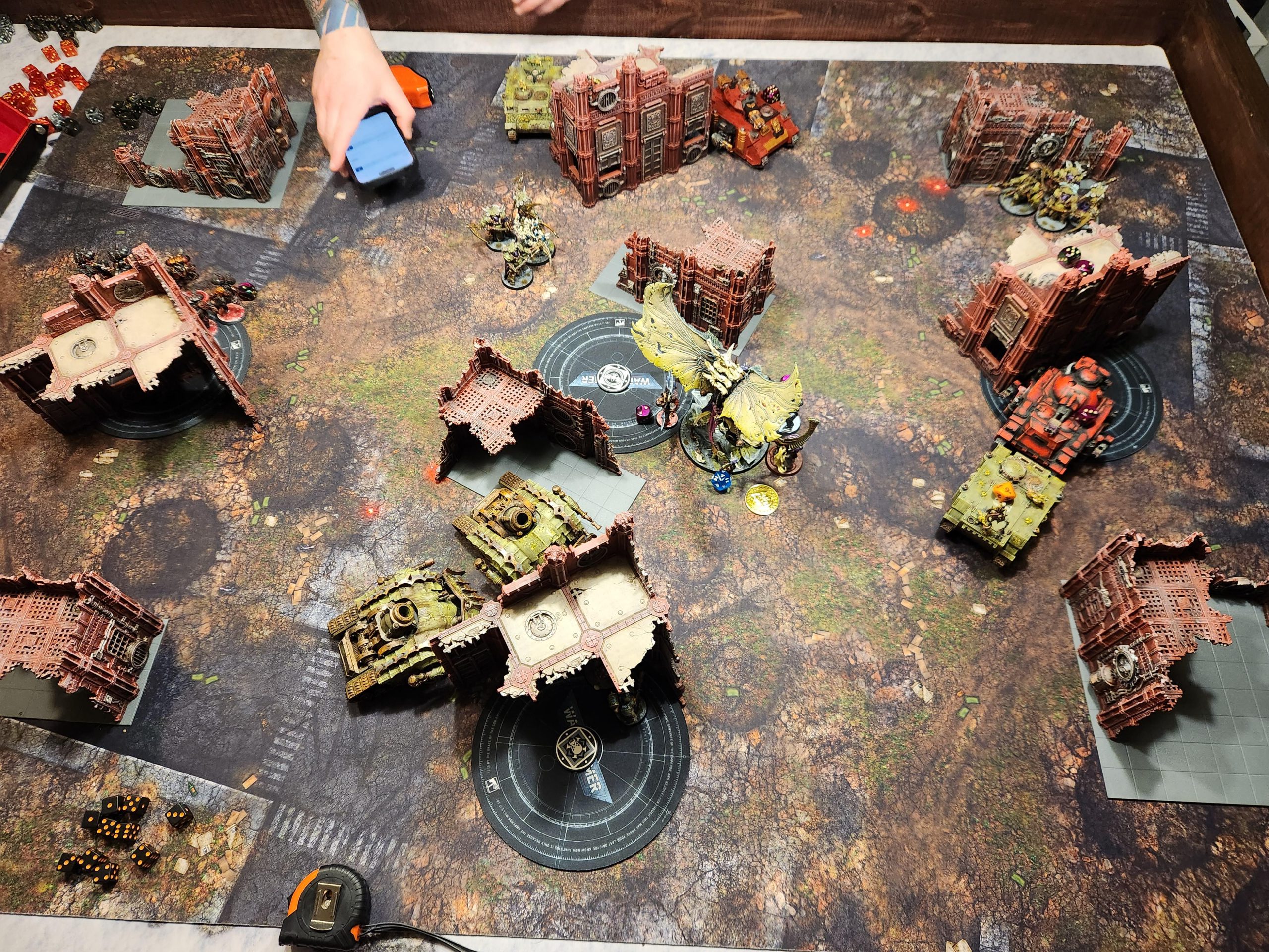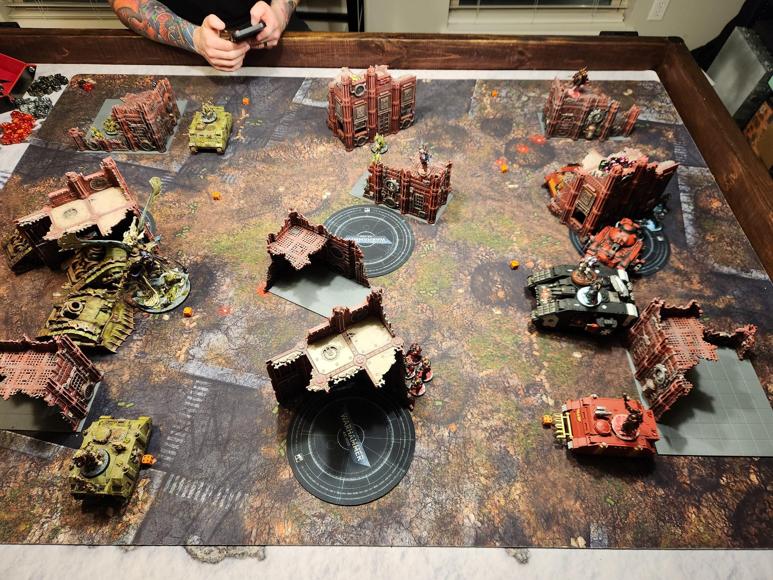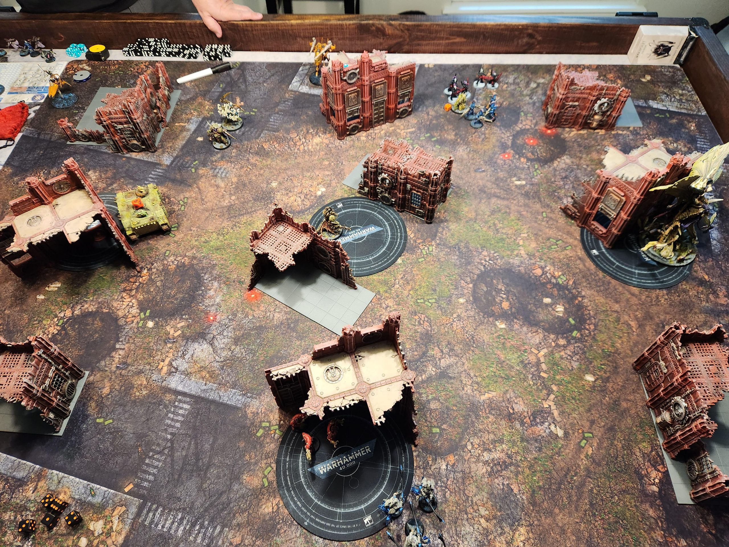 - I should have put the Nurglings in my deployment zone from the first round, using them to screen out deployment on one side of the table. This would have kept Erik out of my DZ turn 1 - and off homers/BEL - while also forcing him to make a decision between shooting my PBCs with his dark reapers or using their indirect fire to shoot my Nurglings - which would likely take 2+ units to destroy. If the Nurglings live, I can use them to create bigger screen bubbles on the deployment zone.