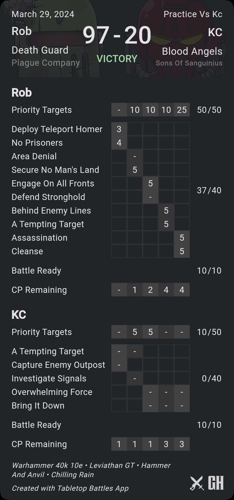 By this point I've still got some challenges - KC drops on my backfield objective and kills my PBC there to clear me off it - but I'm ahead on primary and secondary, and KC's had shit luck with secondaries. I end up more or less tabling him by round 4.