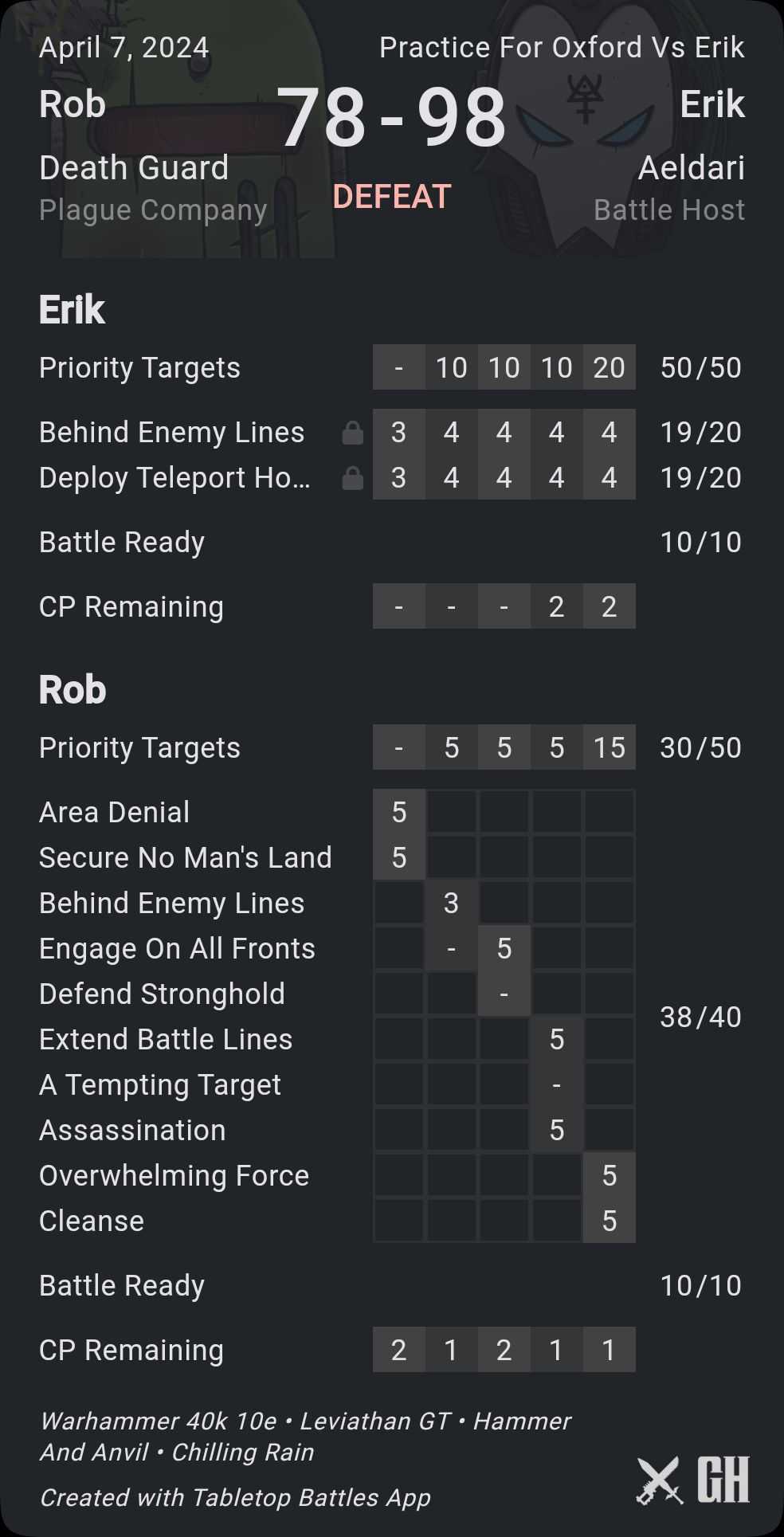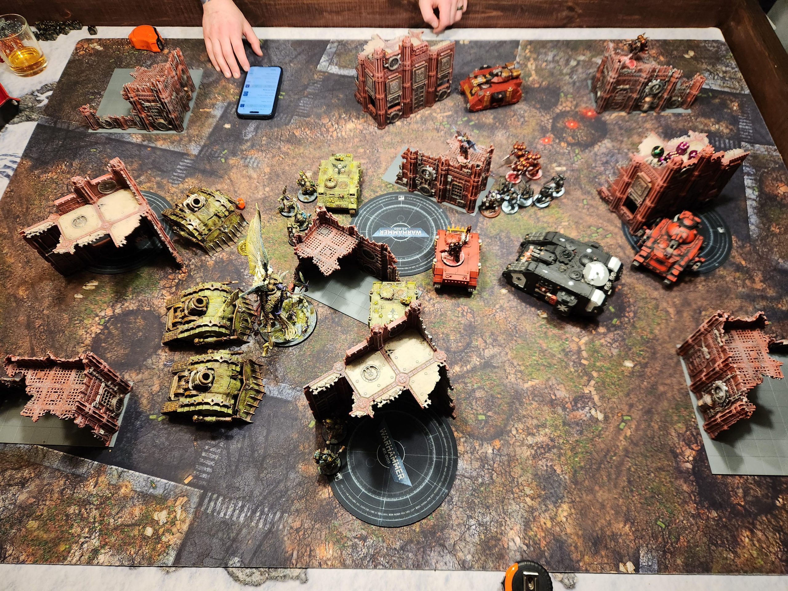 - Generally speaking, I should have spent more effort stopping Erik's scoring and holding units back - getting up the table wasn't nearly that big a deal here, and I could have just focused on a single objective out of my deployment zone.