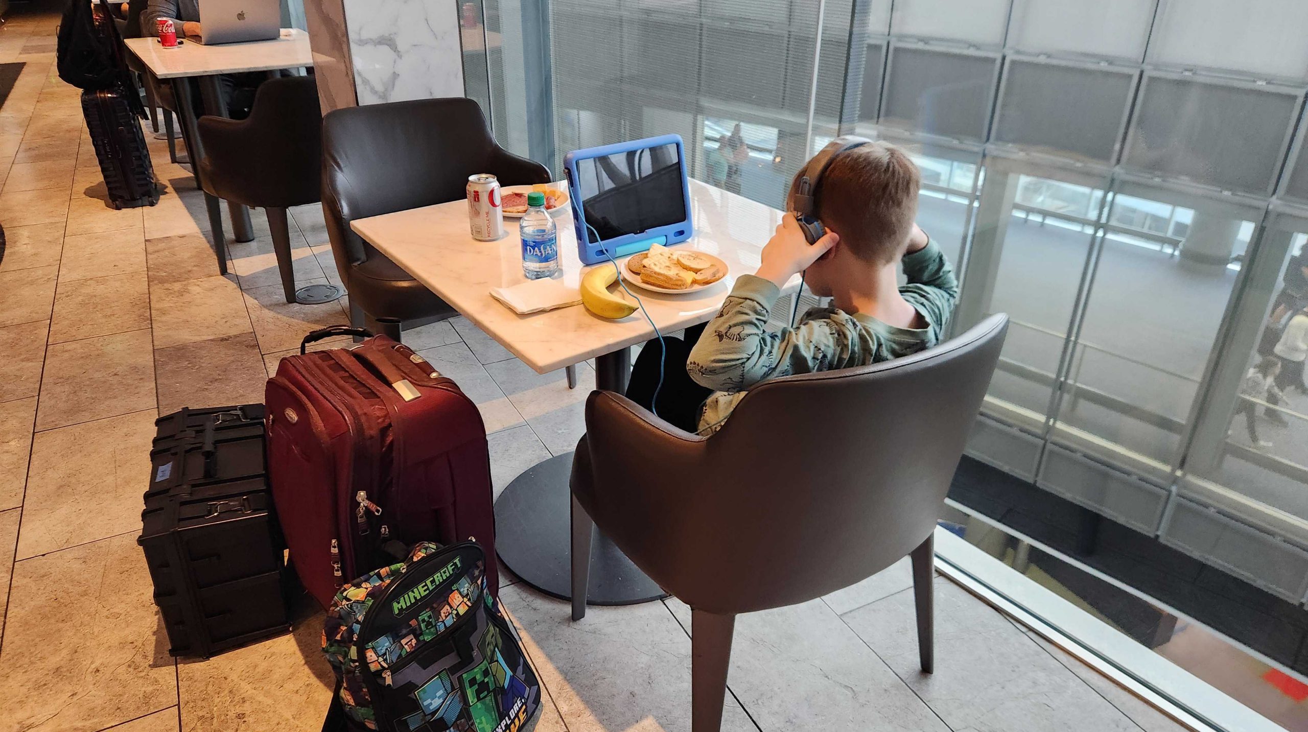 The flight to England went off pretty well. The other upside to upgrading is that we got to eat in the Polaris lounge while we waited, so the boy was properly sated with food before we left (the Polaris burger was absolutely preferable to the plane food). He was a model citizen for most of the flight, though he did do a bit more running around than I would have liked on the planet, but not so much as to really bother anyone. He watched a movie and then dozed off for most of the flight, and I had to wake him for breakfast. I probably did that too early and should have just let him sleep since he didn't eat any of the breakfast but that's a lesson learned.