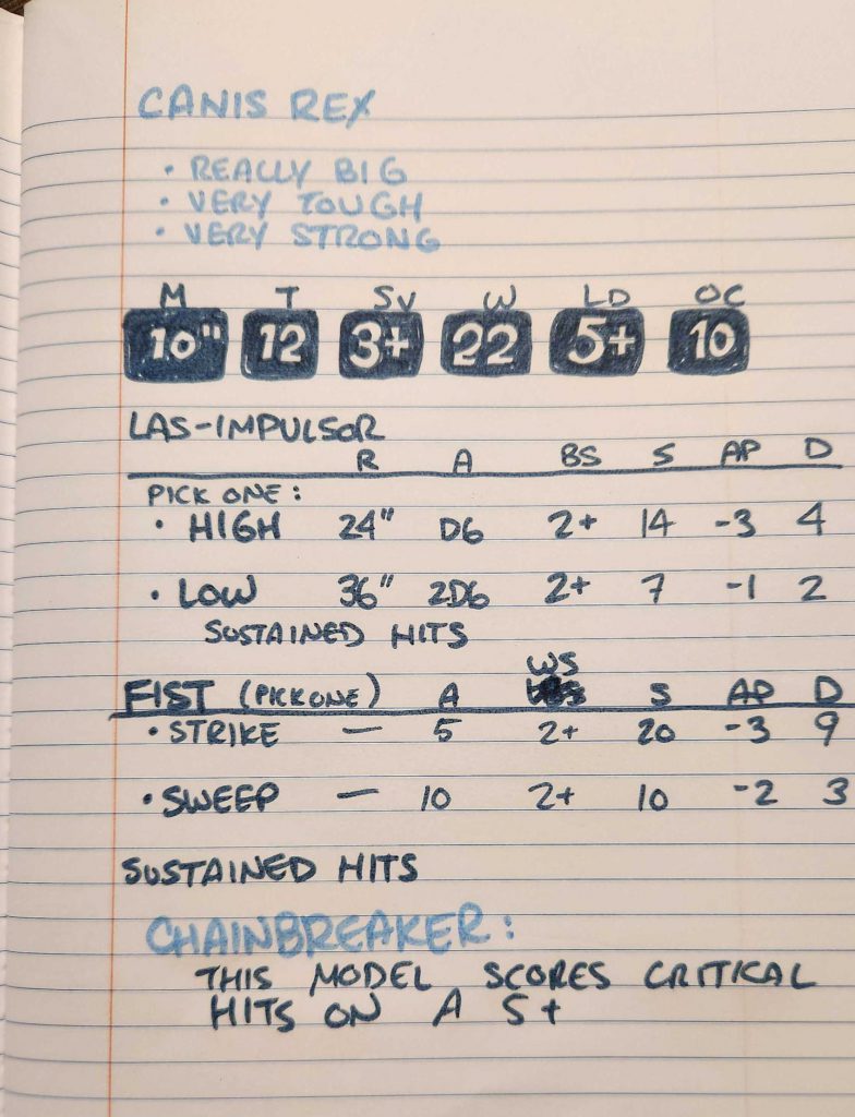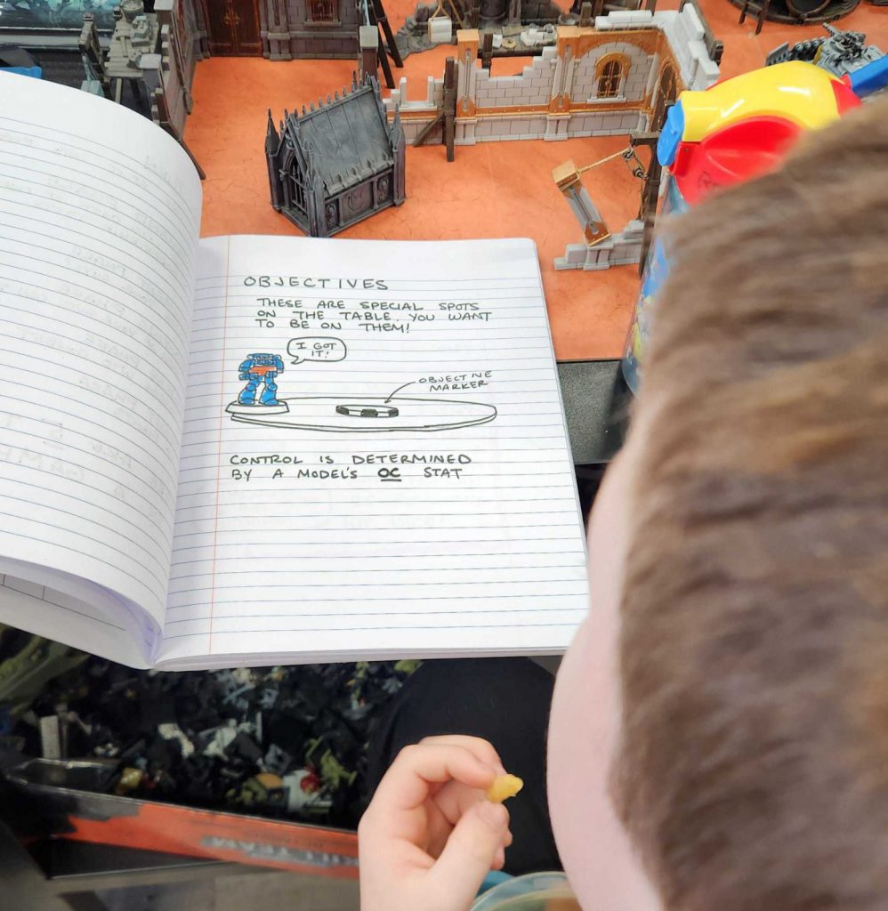 If you don't remember, a while back I made a special Notebook for Bryce to act as his rulebook for the game. Warhammer 40k is complicated and while Bryce is a pretty strong reader - I think he's above average compared to his friends - the rulebook language is difficult enough that I see grown-ass men struggle with it. So I've streamlined the rules down to words and concepts he'll have an easier time with. Before our game I set up the table and I tell him to review his rules in the notebook.