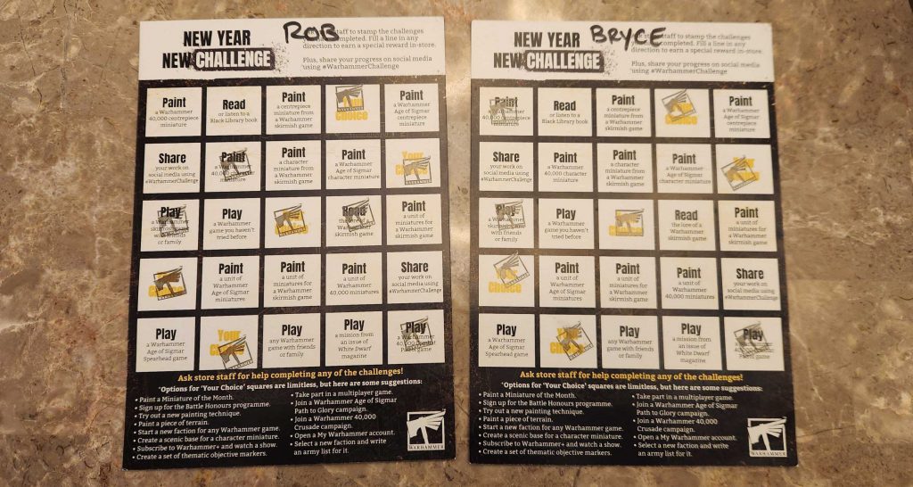 Bryce and I have been slowly working our way through the Hobby Bingo challenge this year, heading over to the local Warhammer store to periodically update Max on our progress and get new stamps on our cards. Over the weekend we added a few new stamps to our cards. I'd previously played a game of Kill Team to get my Skirmish stamp, reading Warhammer Adventures with Bryce, and introducing him to some Warhammer+ shorts (he's lukewarm on them).