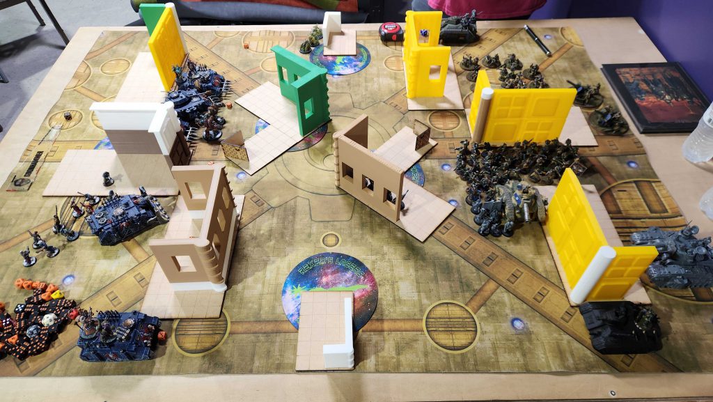 Connor posted a screenshot of his list in the text chat so I don't have the exact list on hand to copy paste but he's running the Siege Regiment, and he's running on older rules. My updated list is only possible because Nurglings dropped 5 points, so we have a brief discussion about lists. This is mostly a mistake on my part - the League is pretty loose on what can be run, and up to now my opponents have been taking lists different to what they originally posted, as they've been testing out other lists. That's fine by me, but Connor isn't on that wavelength, and he's technically correct. I didn't bring the Warp Talons with me, however, so we agree to split the difference - I'll run new Nurglings and my updated list, and he'll get to use the older, more powerful Combat Engineers.