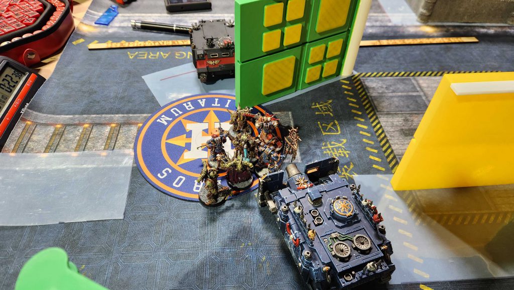 Overall this was a fun game, if short. Franklin essentially ceded the middle of the table to me early on to avoid getting charged and carved up, but then split his army along the left and right side of the table. That's not something he's generally equipped to do with Deathwatch, as he just doesn't have the unit counts he needs to split his army that way. He'd have been better off pulling back a turn and making the middle of the table a killing zone for his tanks. Even if he'd made that 6" charge with his DW veterans on my Vindicator, I'd saved some CP to Heroically Intervene with the Plague Marines, where I could likely wipe his unit and keep my lead on primary scoring (it was 15-3 at that point and I was about to claim his home objective).