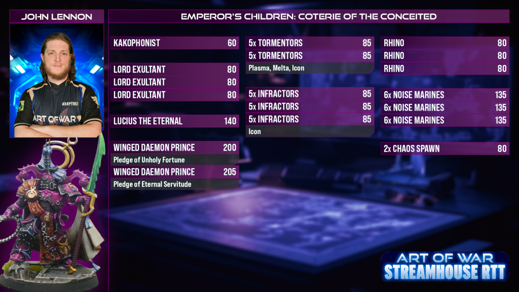 could spend a lot of time testing different variations of this but John's a much better player than I am and the Emperor's Children only have like ten datasheets anyways so every list is going to look more or less the same - so I may as well start from this spot. The only real question here is whether you want a unit of spawn or a second Kakophonist and another enhancement but I think Spawn are too good to not include.