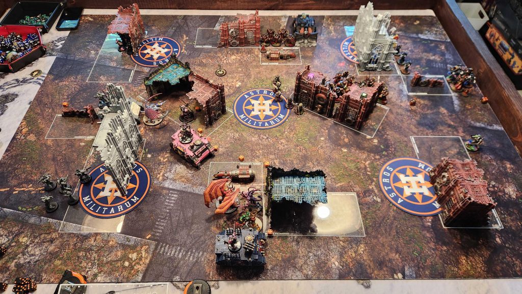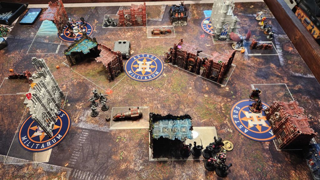 KC's terminators eventually made their way to mid table but the damage had been done. KC's dark angels are an elite army and they need to play aggressively early to avoid falling too far behind on scoring. I did a ton of damage and as we got later into the game KC also got bad draws, pulling Cleanse and Recover Assets on rounds 2 and 3, then Sabotage and Engage on All Fronts in the final round, neither of which was great for what he had left.