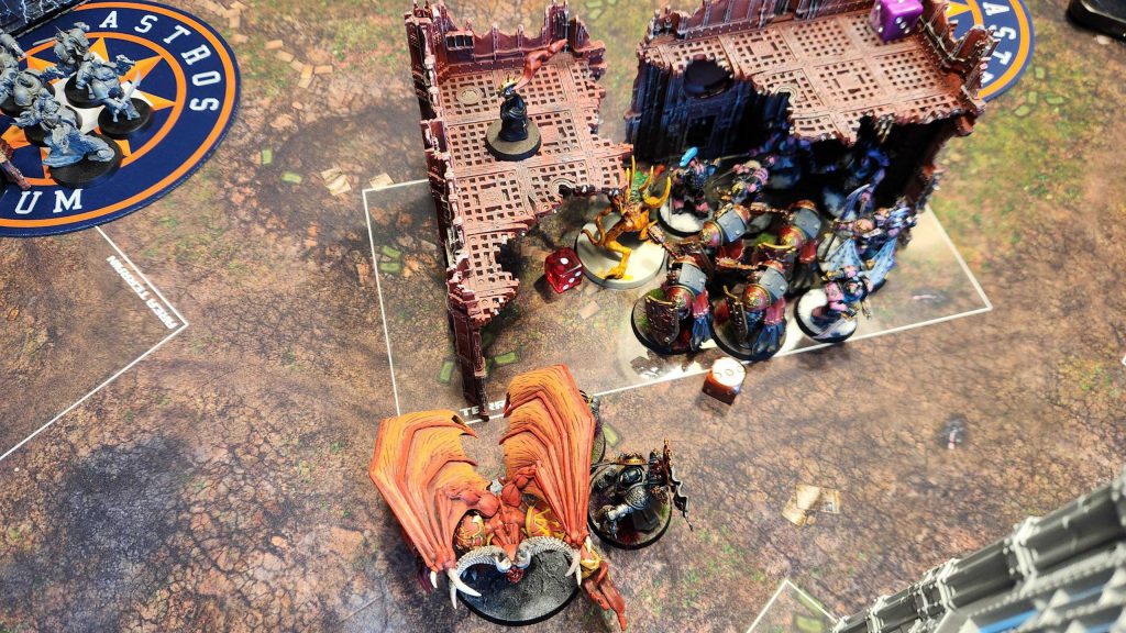 On that note, while KC is a very good player he tends to get a little excited seeing new armies at work and wants to test things out, and that means he's not always playing the mission. That will end up hurting him here as I think he got a bit too aggressive and ignored secondary play. He also just had bad luck with his draws, though - he pulled Marked and Locus on turn 1, chucking Marked to get Bring it Down. He'd end up bouncing off the Daemon Prince, though - it survived with 1 wound thanks to its Pledge of Unholy Fortune.