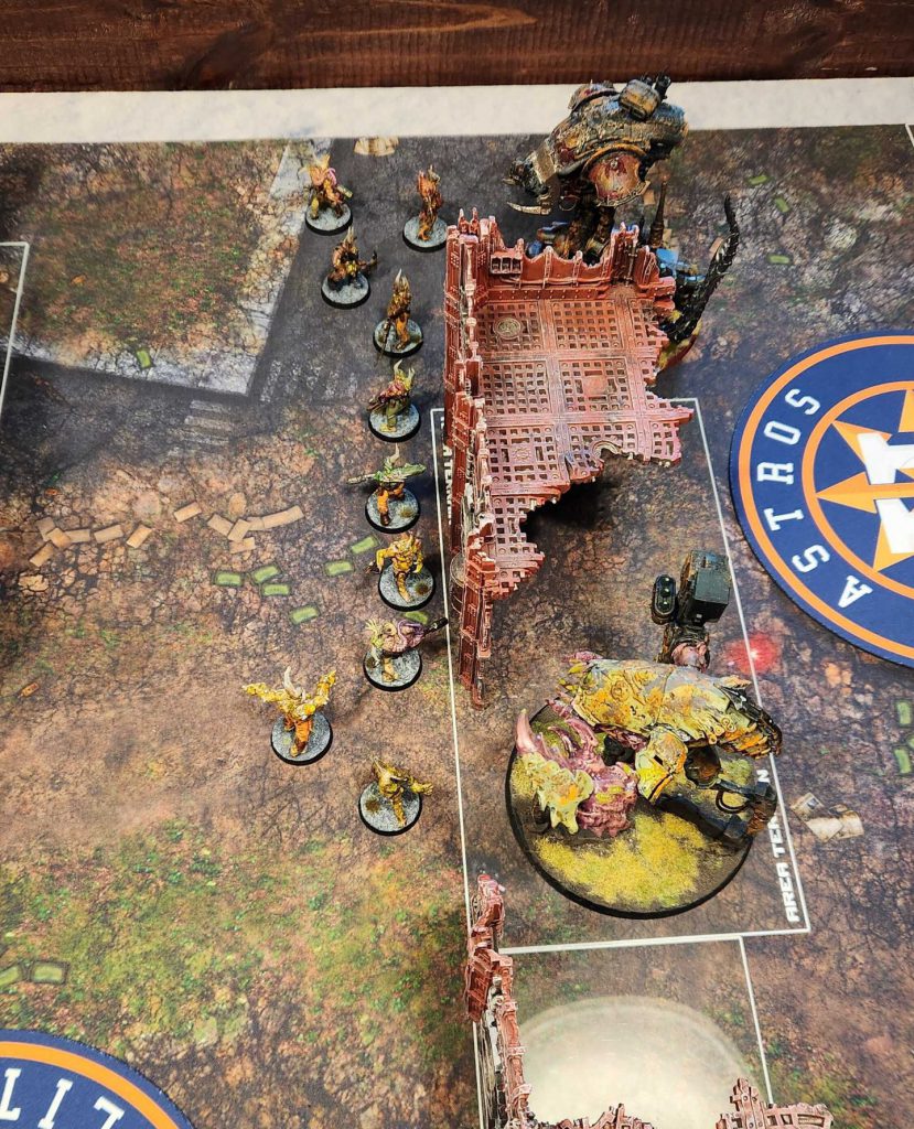 The other two ways to use the Poxwalkers are as back/midfield objective holders and screens - when I'm playing into Coterie, I tend to drop back into my deployment zone far enough to prevent turn 1 charges, and I may screen key vehicles with the Poxwalkers to ensure they aren't getting tagged and killed too early. But if the Coterie player is smart, they'll stage and play a bit more coy, going for a round 2/3 assault with many units to try and jam me instead of outkicking their coverage with a couple of faster units that don't quite get there. In Luke's case, I can afford to sacrifice the Poxwalkers to stuff him while hanging the Fleshmower out as a juicy target to lure out a war dog or two. I can reliably kill three war dogs per turn, maybe four, and that's the maximum number I want to deal with at a time.