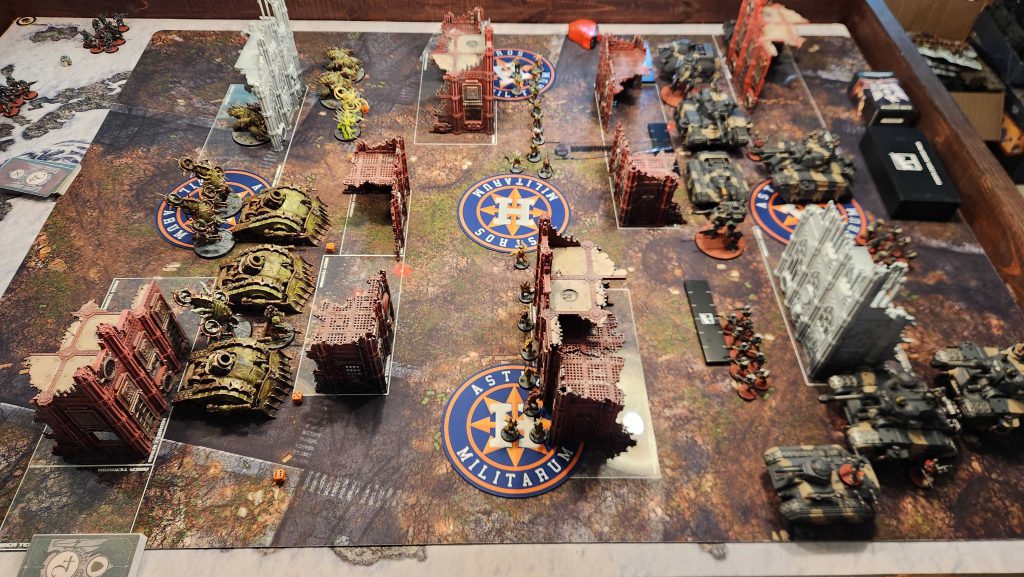 For this game I was up against Andrew and his five-Dorn Astra Militarum list. In addition to his Dorns (two Commanders), he sports two hellhounds and a chimera. That's a lot of beef to chew through, and while this isn't an Imperial Knights list, it offers some reasonable comps in terms of figuring out "how the hell do I chew through those vehicles?" It's also a bit shootier than the Knights list, and can reliably delete smaller vehicles in one volley from each Dorn, so I need to play it coy with spacing and try and alpha strike more often.