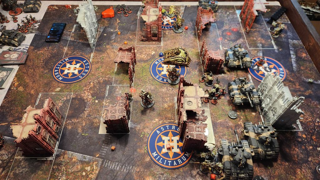There's a fun moment on round 3 where I decide not to kill the last two melta Kasrkin in Andrew's squad so they can't come back with Reinforcements! as a full unit. Then Andrew moves them to the middle of the table to score Area Denial and gets off some lucky shots, killing my bloat-drone there. Which then explodes and kills them with 2 mortal wounds, blanking him on the secondary. Karma's a bitch.