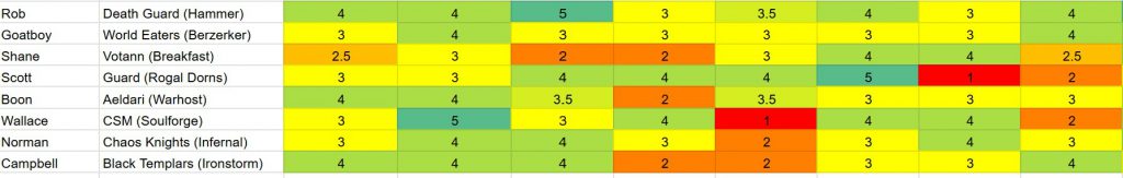 When I built the matrix, I started by having the team fill it in, but I also looked at their most recent tournament games - many of them went to NOVA - and used those scores to fill in scores as well. This gave me a pretty good matrix, but also one that feels wildly optimistic - but this is a problem which i think a lot of player matrices will have. When you build a team of people who win 60-80% of their games, it's not out of the question for them to score all their games as 12+ wins, regardless of whether that's realistic. When I do pairings, I'll be looking for the 3s and 4s and trying to identify where someone has played a matchup before - having faced an army is ultimately the biggest factor in being able to beat them and play well in that matchup.
