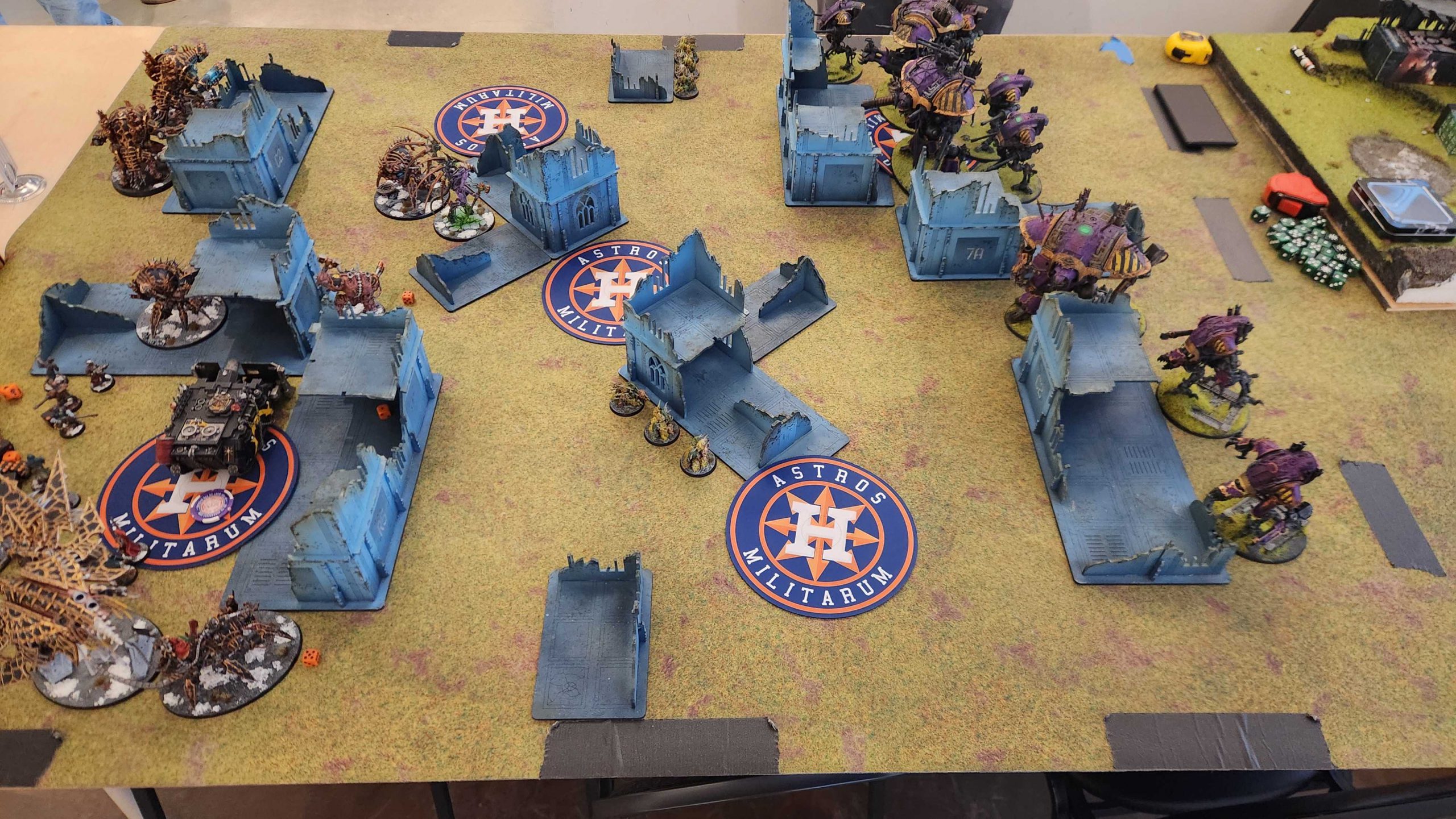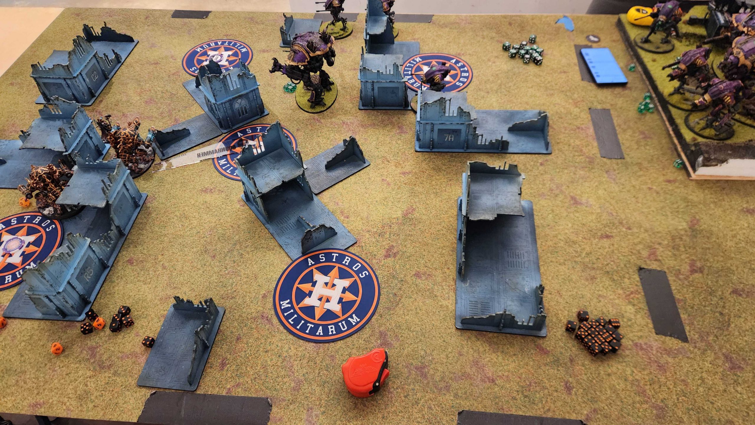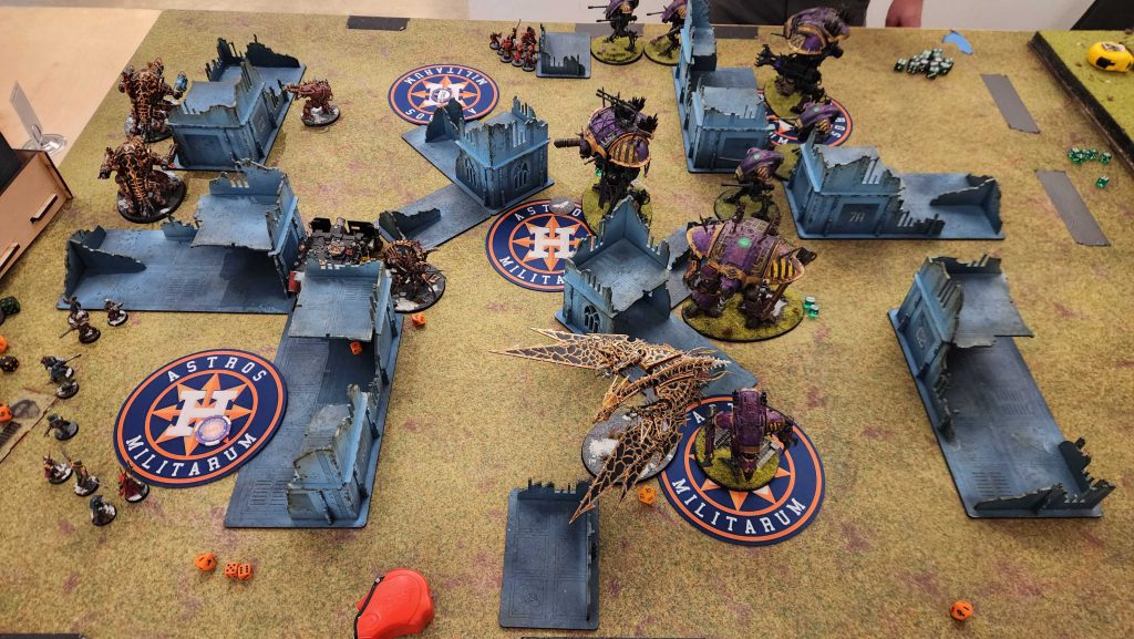 The result is that it takes Kyle four turns to really dig out of his deployment zone, and while he's bodying me with his big knights, I'm able to keep getting lines on the middle of the table, killing the Styrix, Rampater, and most of the War Dogs while keeping a midtable objective stickied all game. we tie on Primary and I end up beating Kyle on Secondaries after he blanks on round 4.