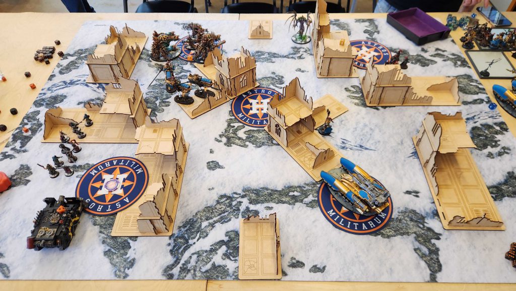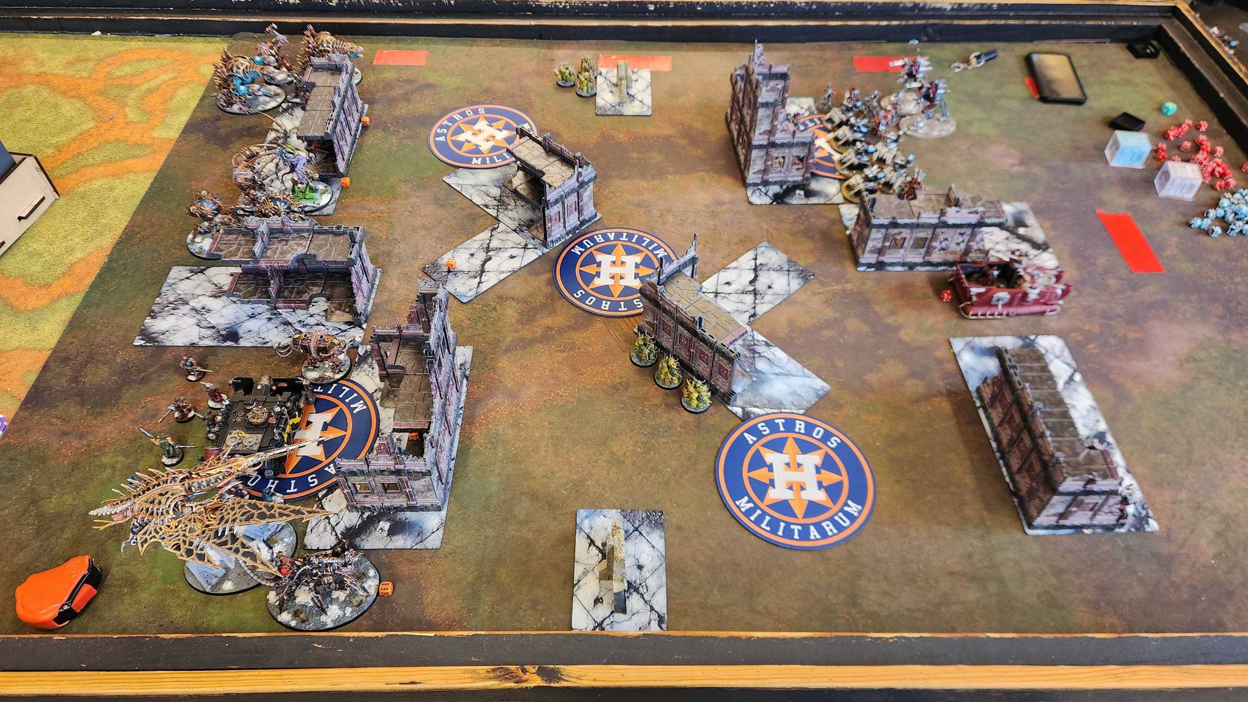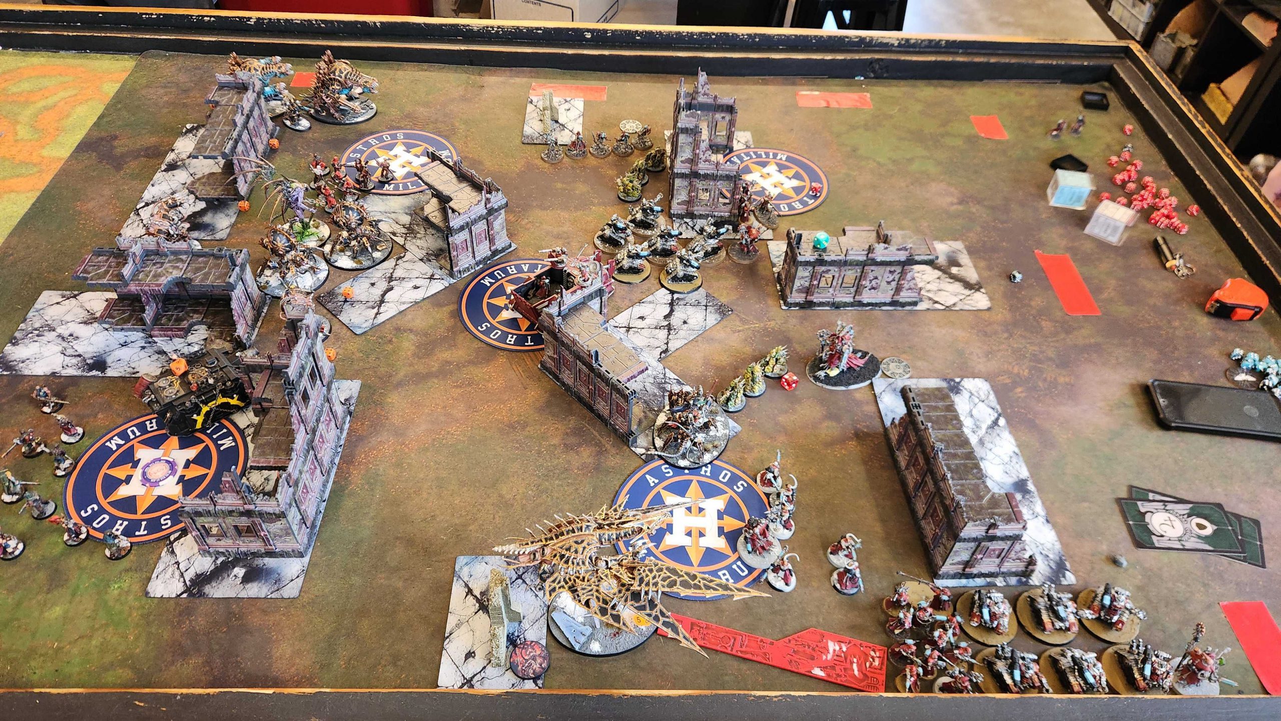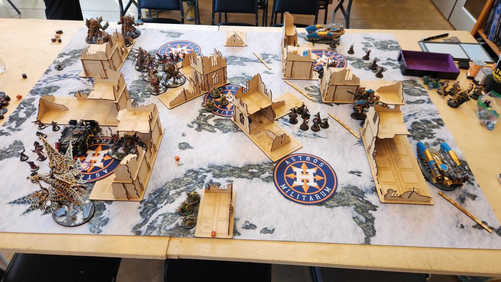 The result is that it takes Kyle four turns to really dig out of his deployment zone, and while he's bodying me with his big knights, I'm able to keep getting lines on the middle of the table, killing the Styrix, Rampater, and most of the War Dogs while keeping a midtable objective stickied all game. we tie on Primary and I end up beating Kyle on Secondaries after he blanks on round 4.