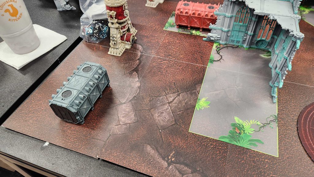 Ryan hit me up first about getting in a game so I agreed to meet him over at the local Warhammer store for a game against his GSC. He and Kevin are practicing for the teams event in Austin next weekend and so any games they can get in before that are good experience to have. The local store is a fine place for a game, but the terrain there is a bit hit-or-miss so I brought some of my own to ensure we had a proper table layout. On arrival, I noticed that the table looked off - it was too long. It was 44" wide, sure, but 66" long?