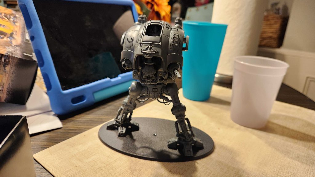 I worked with him on Friday to start and on Saturday he worked with Max to get more of the model done. Our plan right now is to assemble the frame, then prime it and the armor plates separate, so we can do the frame in Leadbelcher and the plates in Retributor Armour, matching it to the gold of his King Warrior space marines.