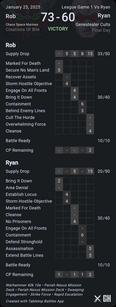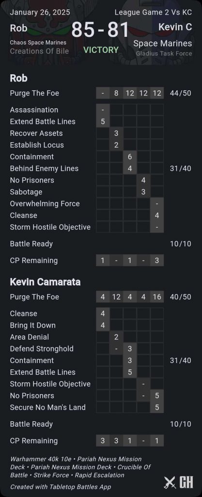 Most of my advantage came early - I was able to score the middle objective on turns 2 and 4 thanks to having tanks to put on it, though Ryan was frequently able to one of my objectives away from me using Gargoyles or clever combat movement. The big difference was holding the left side objective - I put Plague Marines in his backfield on turn 3 and tied up his Ridgerunners with them and the Nurglings, forcing him to shoot his way out and keeping him off the other disappearing objective - this would nab me 8 primary VP on round 4. Ryan also ended up doing OK for himself on Secondaries late, pulling Containment and Assassination/Extend in the final rounds to score 11 VP and tie things up there.