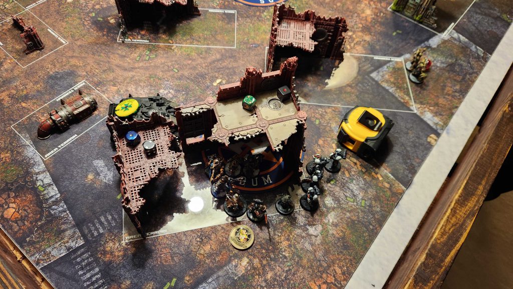 KC makes a late-game push for the middle of the table with his Aggressor blob and they're a big enough unit to stretch across two objectives and make some shenanigans possible. That said, I get some big hold more/kill more turns on 3 and 4, giving me 12-4 advantages. KC pulls No Prisoners and Storm hostile on round 4 but neither are scorable for him at this point - he can't retake his still stickied home objective, I don't hold the middle, and he has nothing he can kill round 4.