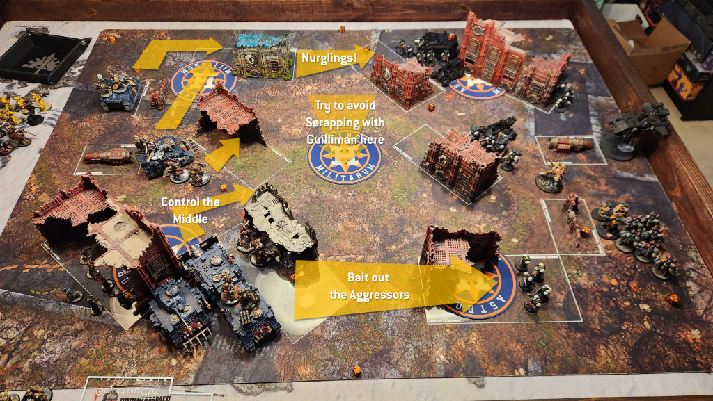The Nurglings are a bit of a liability in this matchup as easy kill points on turn 1, and I'm not sure I made the correct move with them. My strategy was to run them forward and block in KC's Vindicator, preventing it from coming out and supporting his army while I moved into position. With the other Vindicator in reserves until the bottom of turn 2, this meant I could effectively control the middle of the table, keeping KC from trying to challenge me there early, for fear of being shot to death by the Predator/Vindicator. The one big threat I was worried about here was the Aggressor blob, but KC put them far enough back that it would take them a while to actually get to the action. I don't want to end up scrapping with Guilliman at the middle of the table but if I can disable KC's ranged support early and take out his Scouts and midtable infantry before help arrives, I can speed bump his Aggressors and prevent them from being meaningful players in the game.