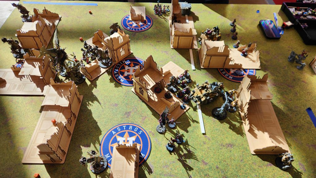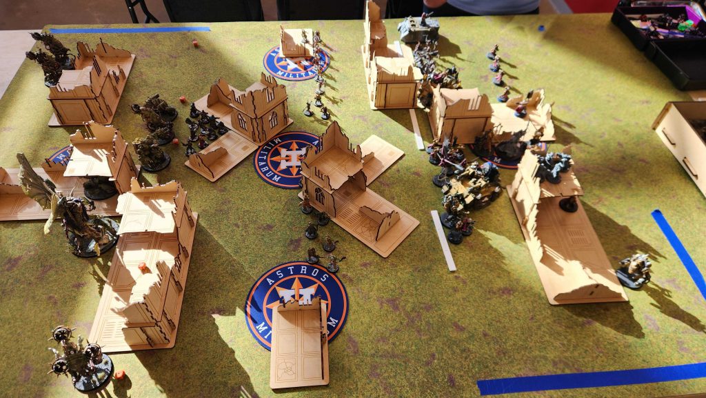 That mattered a ton - on Chris' turn, the Rough Riders failed their Battle-shock test, meaning they didn't hold my home point and couldn't score him hold 2 or hold more. I kept the lead going into the final turn, where I was able to handle the Dorns eventually with help from the Daemon Prince and the other unit of Deathshroud and I got super lucky drawing Cleans and Area Denial on the final turn to win 76-67. I definitely misplayed at the start, got lucky at the end, and didn't have to fully answer for my bad decisions.