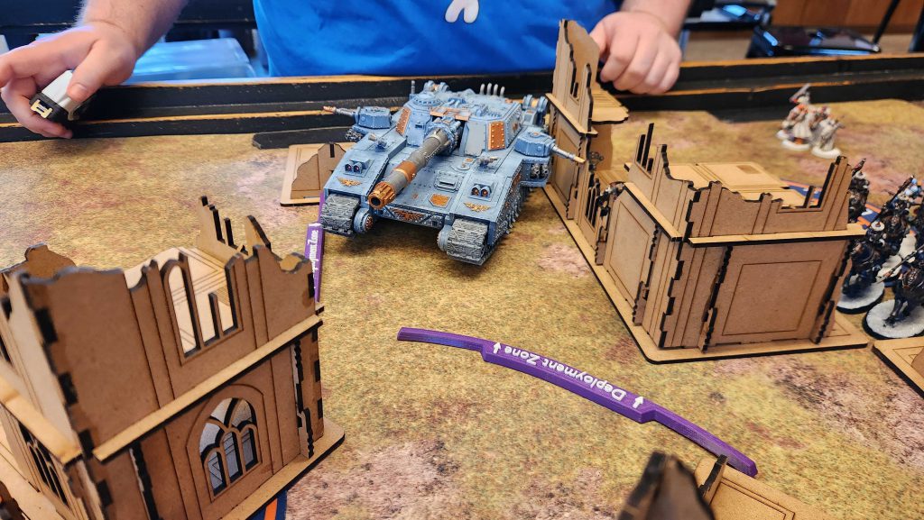Chris is testing a bold idea: Running a Banesword for his Teams list for LVOTT - he's on my team for the upcoming event. It's a solid idea given that, as defender, he'll have the pick of terrain. The Banesword is a nasty threat and huge in the mirror match, but will struggle if you can't get terrain pick. It's particularly screwed here, as it's unable to move out of the L-ruins on Layout 1. His plan is to use Leontus to redeploy it forward after deployment and hope for first turn.