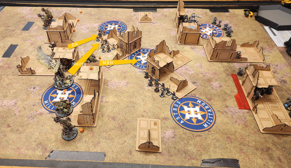 I win the roll-off and while normally that's not ideal here - I'd love to watch him move out full send and give me juicy targets to pick off - I can work with it. My plan is simple: The MBHs are low-value here in a game where he has no monster/vehicle targets. So I'm going to stage with Morty and the DP and put one on the middle objective early and use it to bait out his Eradicators on the other side of the wall. if he takes the bait and comes out, I'll kill them immediately and put Mortarion in his face. If he doesn't, I'll sticky that objective and jam him in his DZ another round.