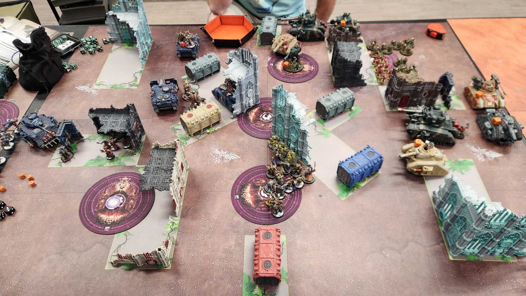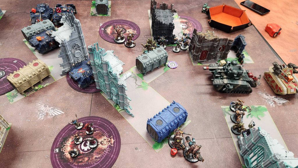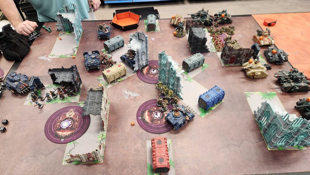 I draw Marked for Death and Behind Enemy Lines and retaliate by advancing and charging the Warp Talons who showed up last turn - I roll a 6, and crash in, killing a whole squad of mortars (who were marked) with only four Talons after one was killed in Overwatch. The Lord and his crew destroy the Dorn in melee after he hulks out, and I'm able to whittle the Demolisher down to bracket levels. On the South side of the table I have a bit more to deal with as I lose most of the Chosen and the Nurglings, but the Obliterators are there to help out and drop melta shots into the tanks.