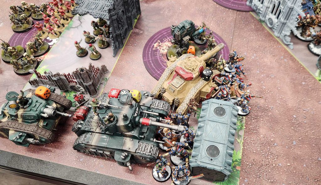 The Russes don't scare me much, but at T12 the Dorn is a bigger pain and generally speaking they're all a problem. My key challenge here is to make sure I get the first shot with my Vindicator and Predator - I'll need them to act in tandem here - and try and kill targets without leaving myself open to being shot back. Generally speaking, the way my army deals with tanks is to whittle them down to half strength or less with a mix of grenades and shooting, then finish them off with a unit that has multiple power fists and can Pact for Lethal Hits. Russes are a lot easier for this than Dorns, though Tank Commanders being unable to blank incoming damage helps.