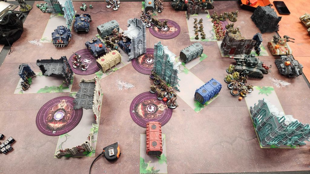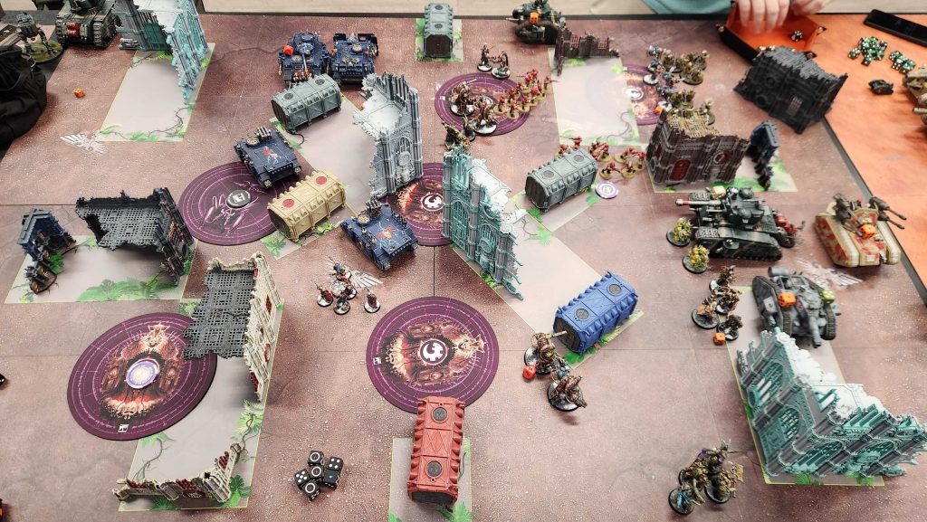 From here it's mostly clean-up. Greg doesn't have the units left to really challenge me, and I am likely to table him with what I have left. I pull Storm Hostile and No Prisoners for added insult and score 9 off those, then I snag Cleanse and Engage on the final turn. Greg will score a few points for Secure and Containment on the final turn but that's about it. We call it around 5:30pm.