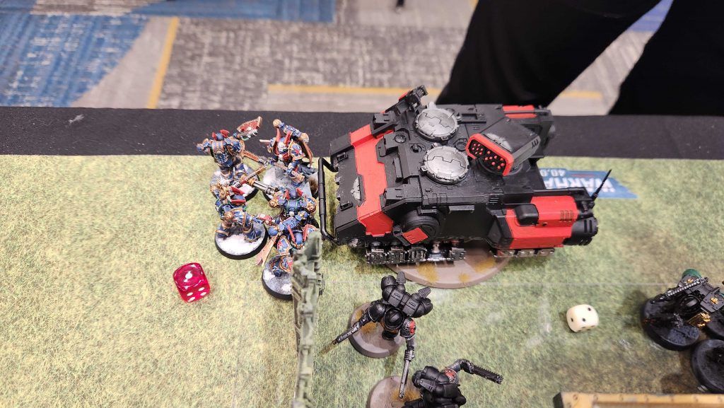That is just the game right there, and everything else is a slog toward a loss. The Lancers can pick off my remaining vehicles with impunity, the Sanguinor kills half of my Warp Talons when they arrive, and I don't have the parts I need to hit him back when he has Assault Intercessors and Death Company in my Deployment Zone.