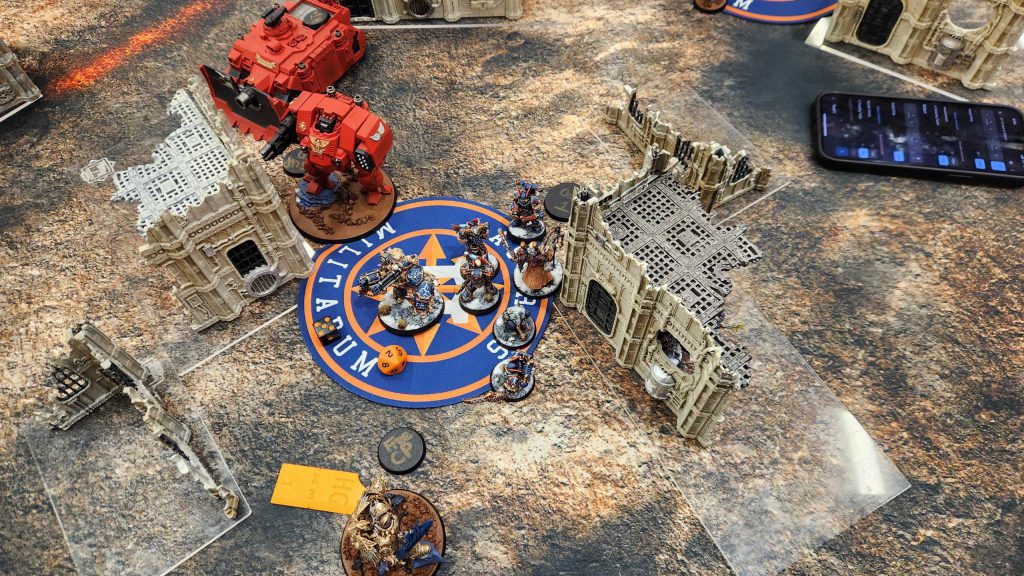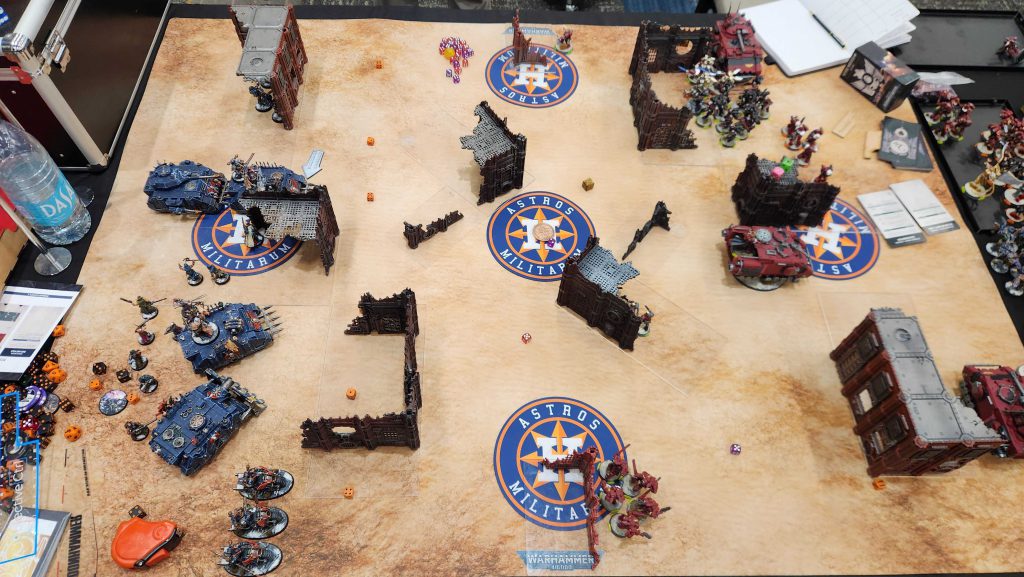 This is a bad matchup for me and it's made worse by the fact that nothing goes my way. My early charge into the Lancer up top becomes a disaster when the Chaos Lord's unit rolls a 10" charge (I needed 8 or less) and gets intervened into by the fights first jump captain, and gets completely destroyed before they can fight. The other lancer survives a turn of Oath'd shooting from a predator and two Obliterators, then takes zero damage from the Obliterators in melee after they charge.