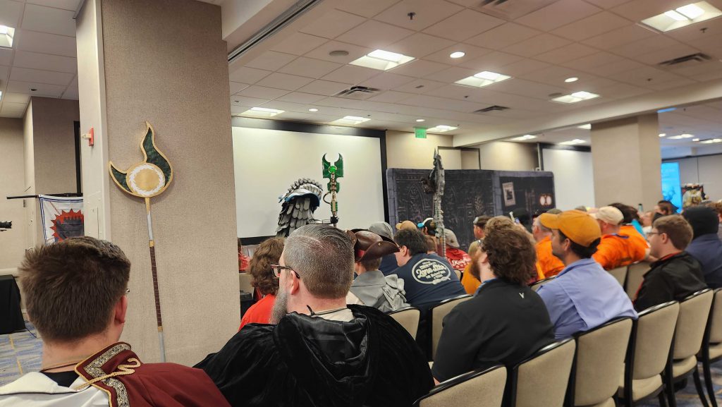 We get some photos with the Space Marine and then watch Trazyn stomp around upset. He's definitely the best part of this year's Grand Narrative - the costumes are generally a step up from prior years - but he's also the most engaging actor this time around as well. There's something about this whole thing where you can't play it too seriously - no matter how good your costumes, you're still in a Hyatt ball room talking to a bunch of guys playing a game. This needs exaggeration, pantomime, and scenery chewing, not your best effort at Shakespeare. Trazyn is an inherently funny character with his habit of putting people into pokeballs and fits this type of scene well, and everyone loves him.